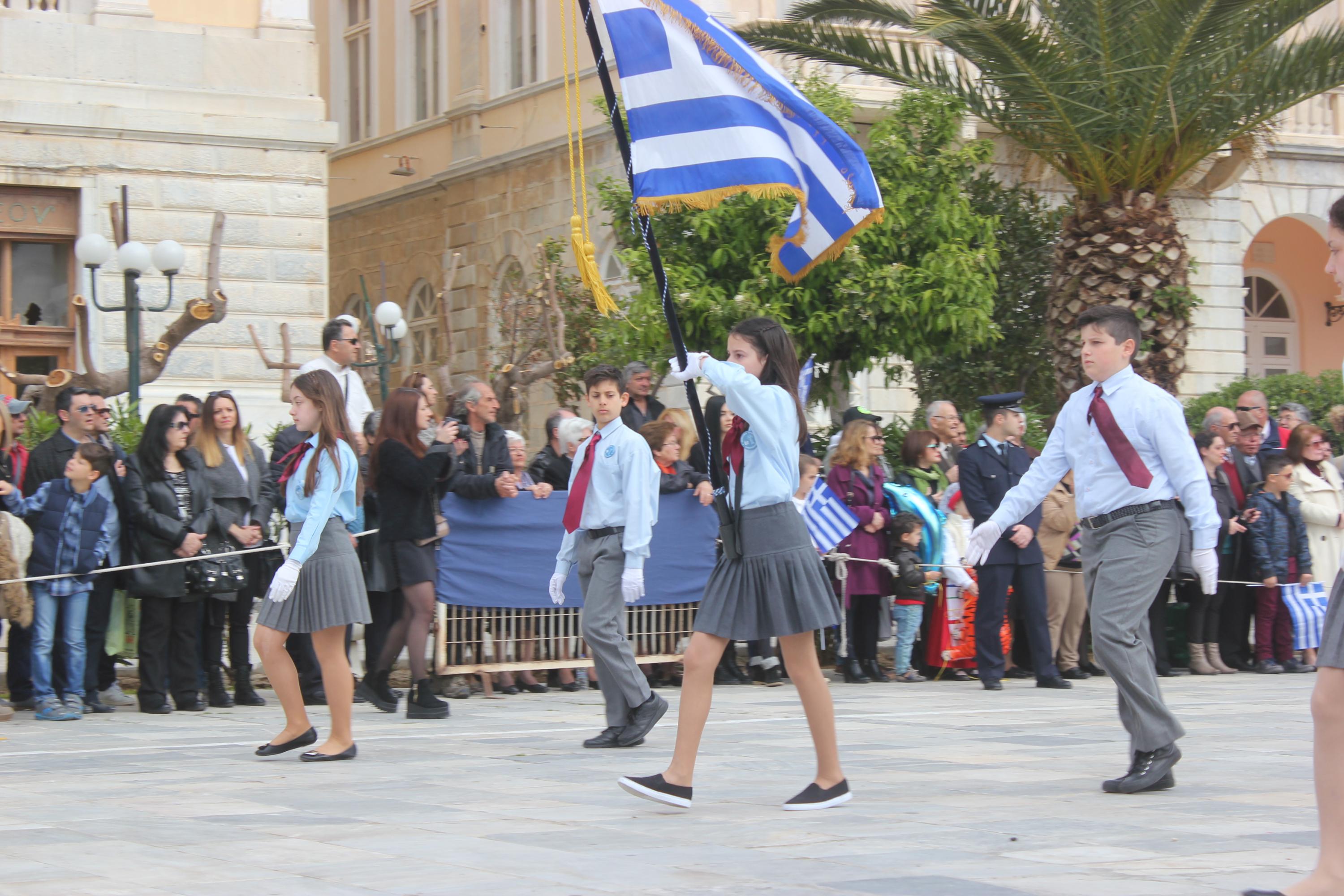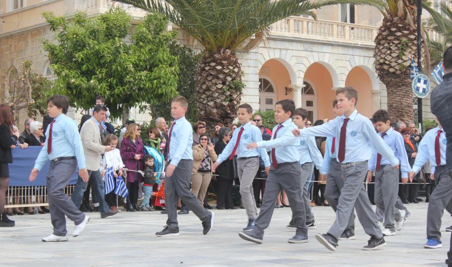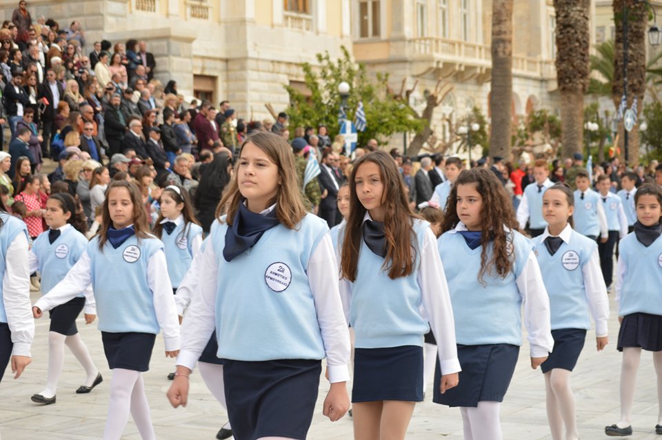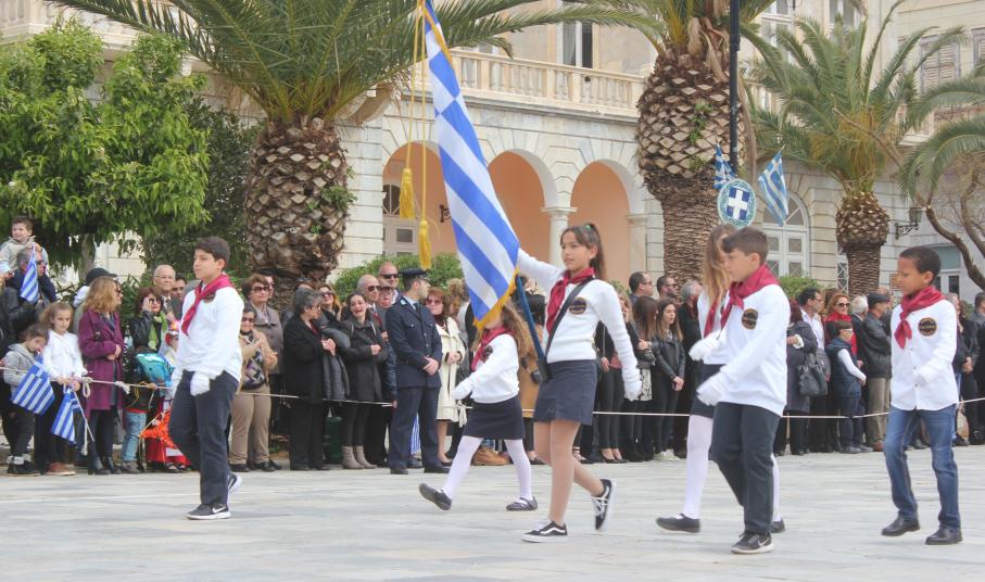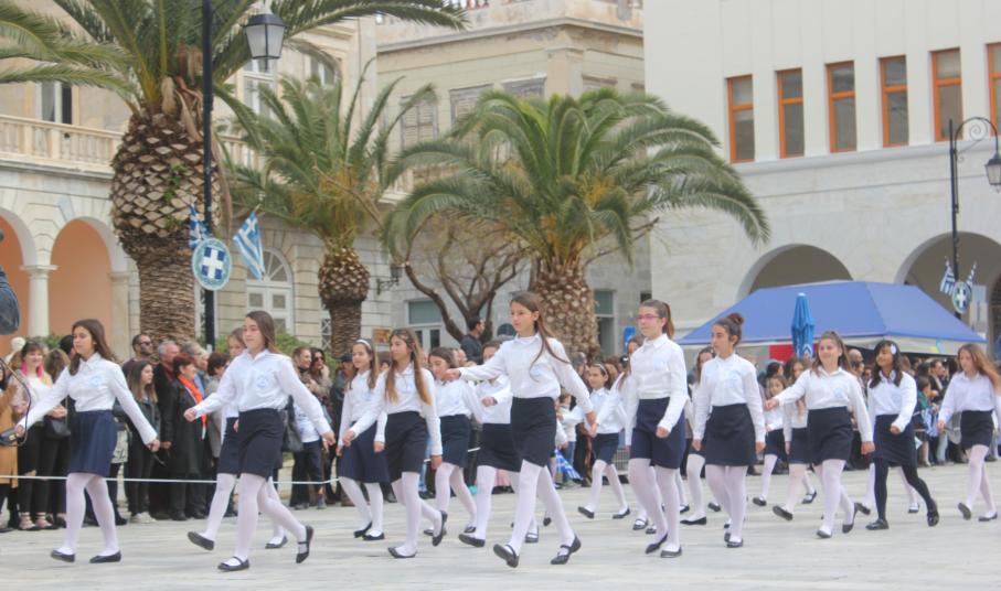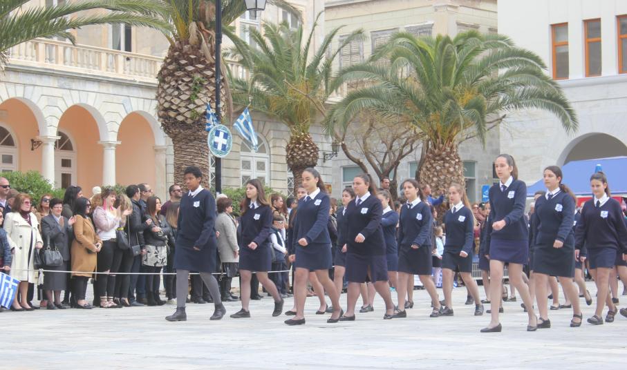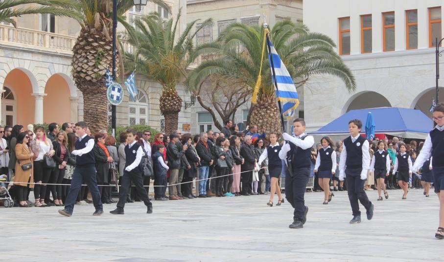 Μετά το πέρας της Επίσημης Δοξολογίας στον Ιερό Ναό Αγίου Νικολάου Ερμουπόλεως, παρουσία του εκπροσώπου της κυβέρνησης Λευτέρη Κρέτσου, γενικού γραμματέα Ενημέρωσης και Επικοινωνίας, του Βουλευτή Κυκλάδων Αντώνη Συρίγου, εκπροσώπων της τοπικής αυτοδιοίκησης, των στρατιωτικών και των σωμάτων ασφαλείας, συλλόγων και φορέων της Σύρου, πραγματοποιήθηκε η καθιερωμένη μαθητική παρέλαση.