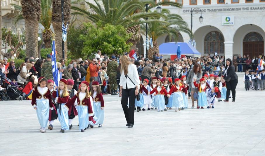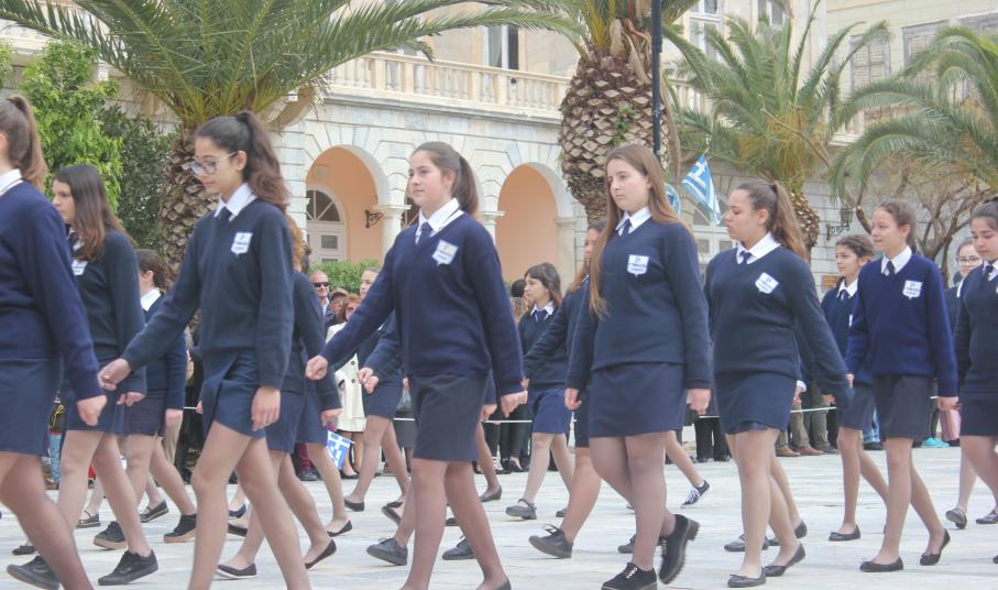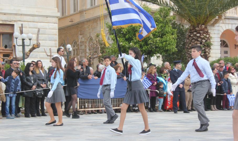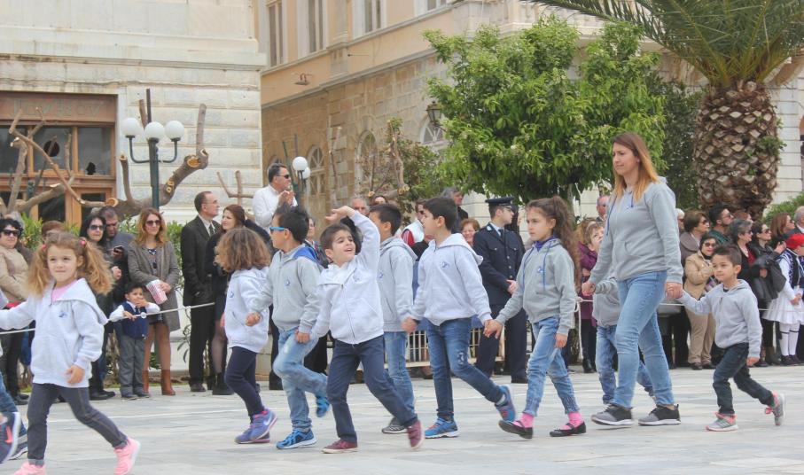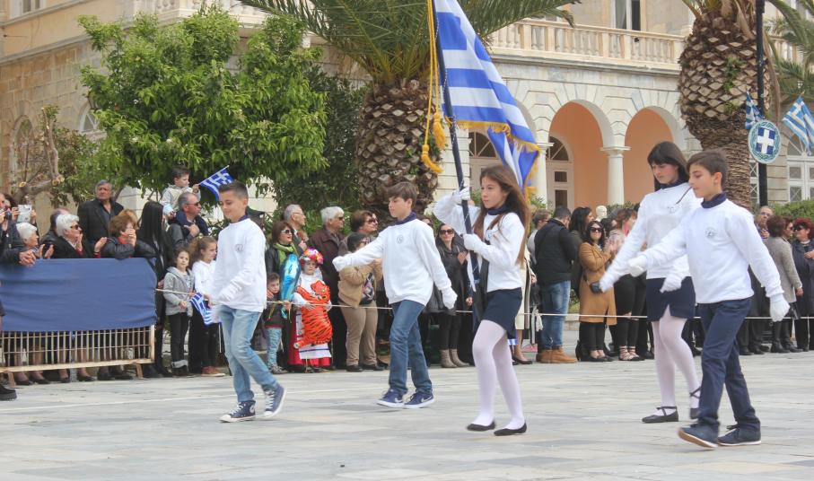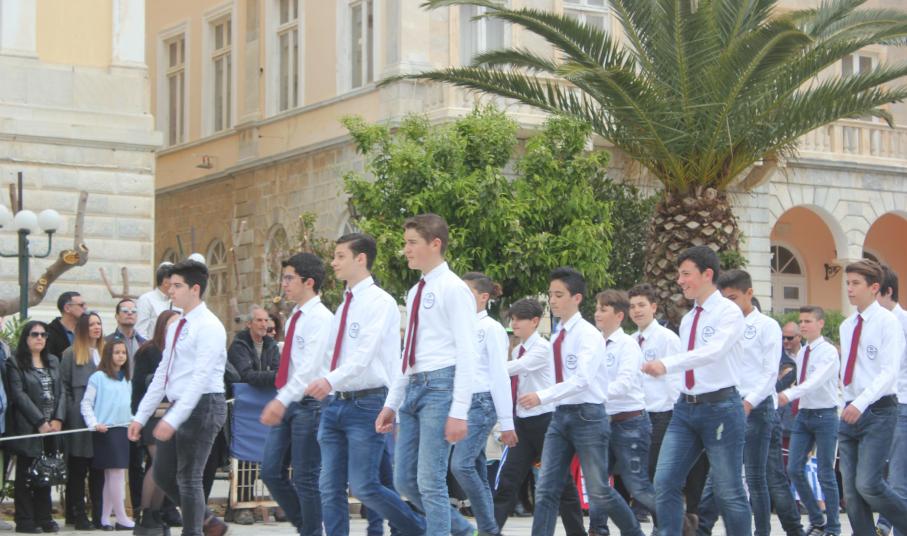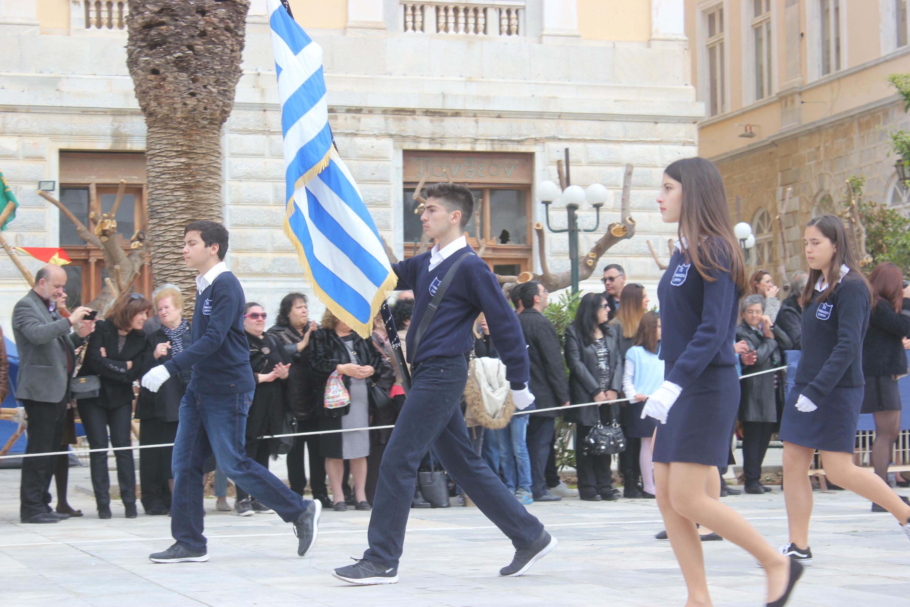 Μετά το πέρας της Επίσημης Δοξολογίας στον Ιερό Ναό Αγίου Νικολάου Ερμουπόλεως, παρουσία του εκπροσώπου της κυβέρνησης Λευτέρη Κρέτσου, γενικού γραμματέα Ενημέρωσης και Επικοινωνίας, του Βουλευτή Κυκλάδων Αντώνη Συρίγου, εκπροσώπων της τοπικής αυτοδιοίκησης, των στρατιωτικών και των σωμάτων ασφαλείας, συλλόγων και φορέων της Σύρου, πραγματοποιήθηκε η καθιερωμένη μαθητική παρέλαση.
