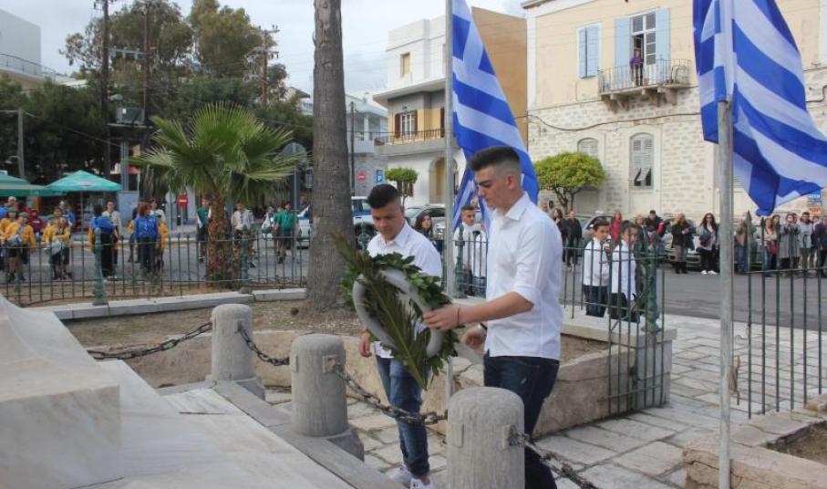 Παραμονή της Εθνικής Επετείου, σχολεία της Πρωτοβάθμιας και Δευτεροβάθμιας Εκπαίδευσης, σπουδαστές και πρόσκοποι της Σύρου κατέθεσαν στεφάνια σε έξι συνολικά μνημεία της πόλης.