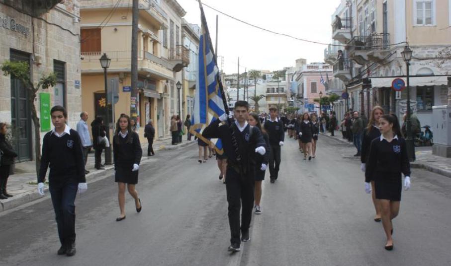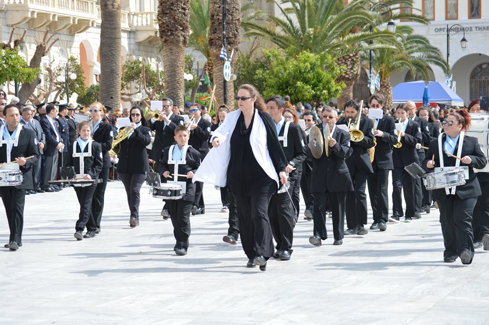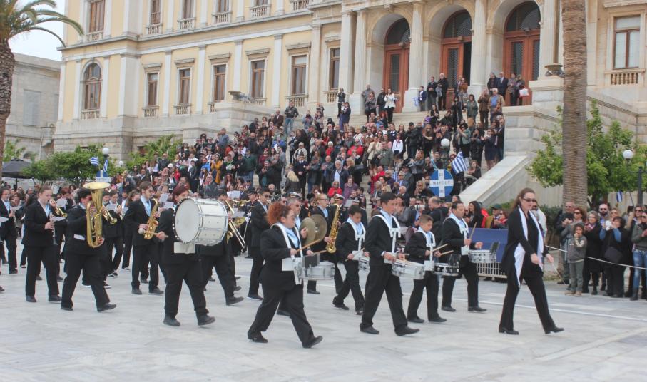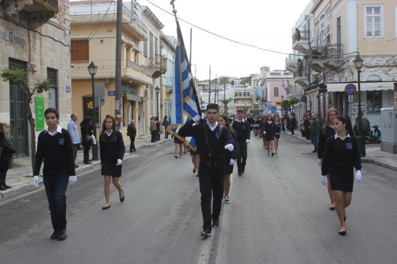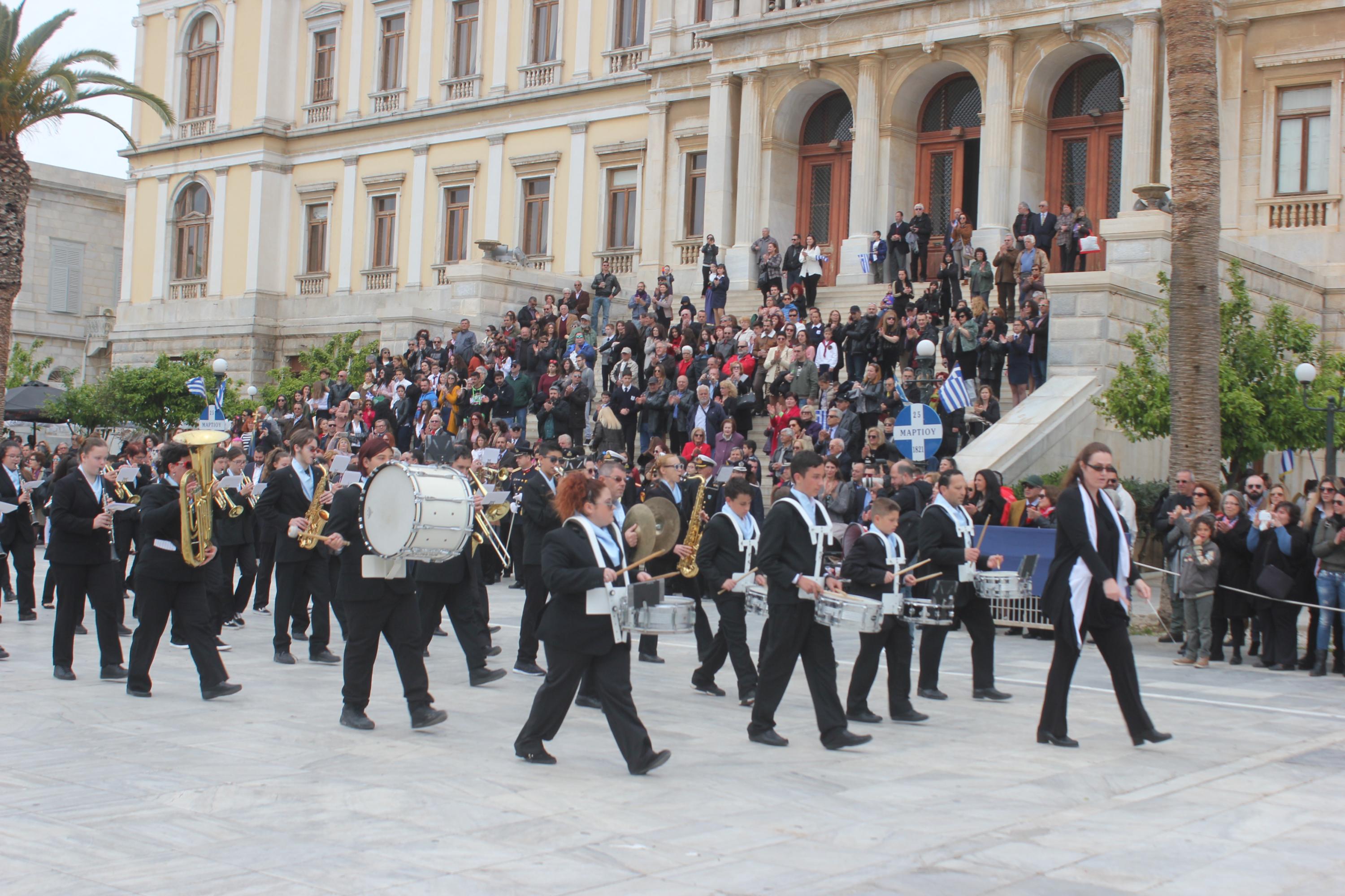 Οι εκδηλώσεις κορυφώθηκαν με την καθιερωμένη παρέλαση στην πλατεία Μιαούλη, η οποία άνοιξε με τη Φιλαρμονική του Δήμου Σύρου – Ερμούπολης, στην πρώτη επίσημη εμφάνισή της, μετά την επιστροφή της αρχιμουσικού, Alice Labarche.
