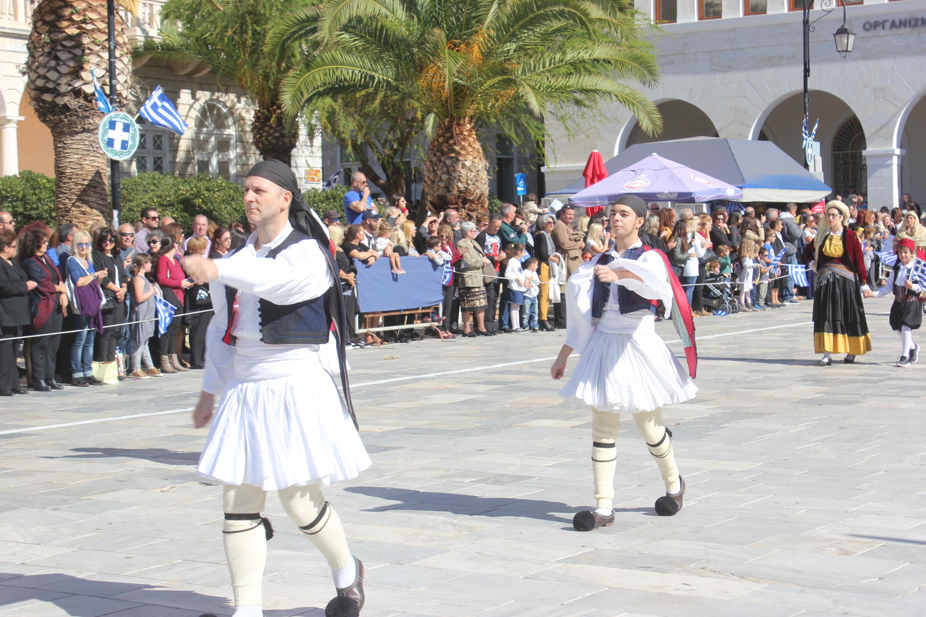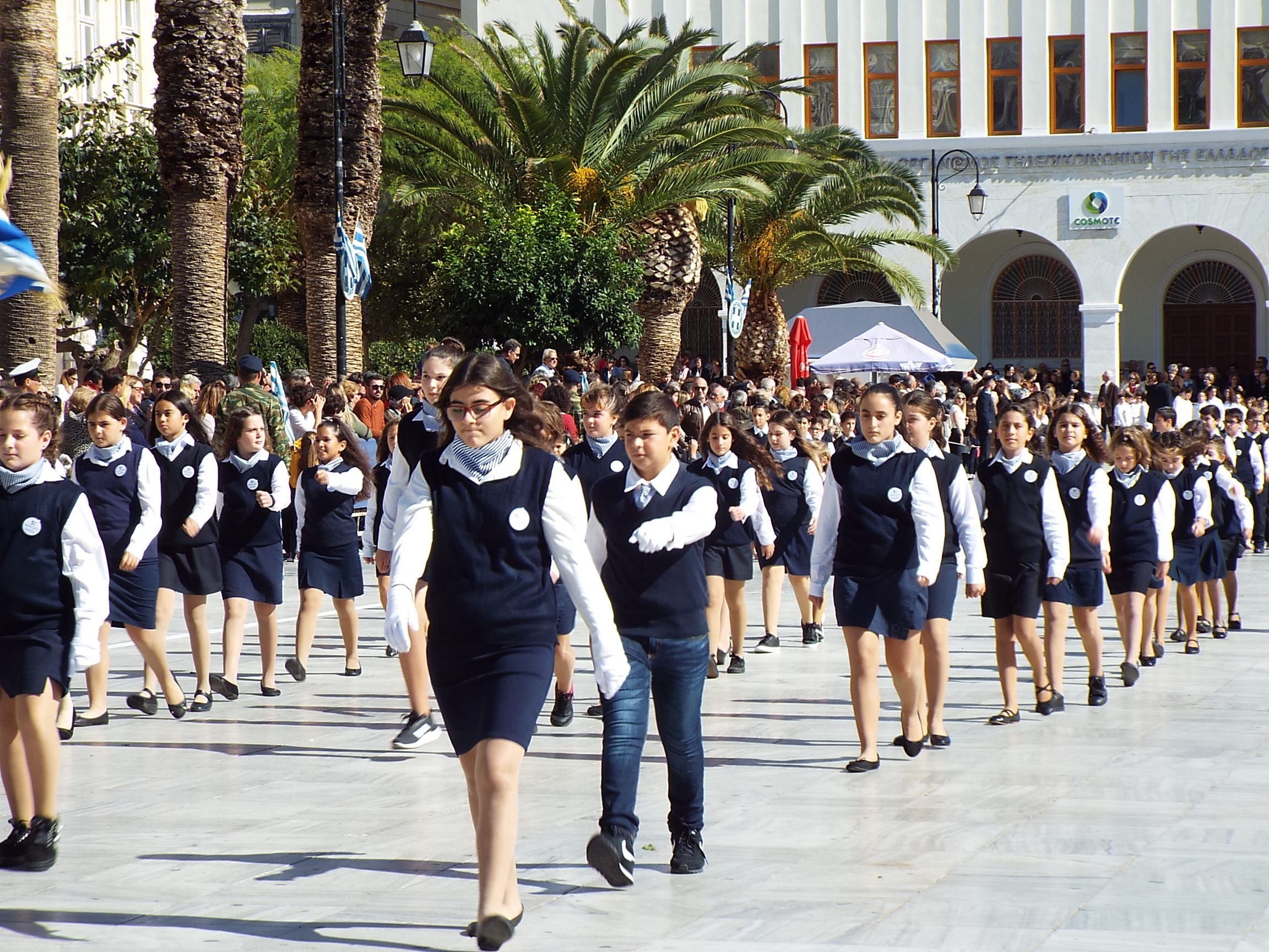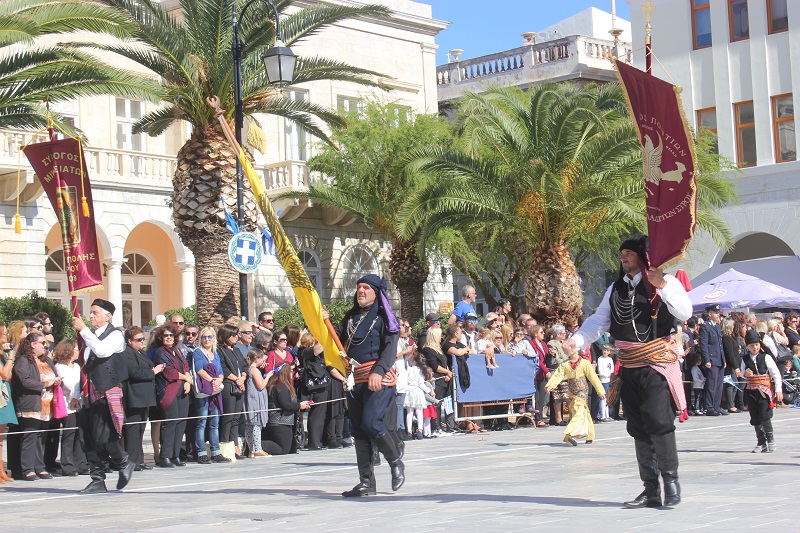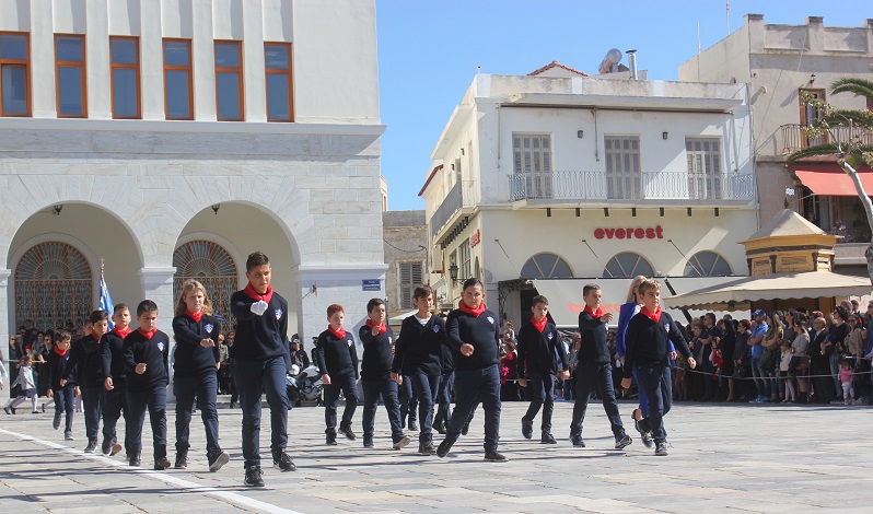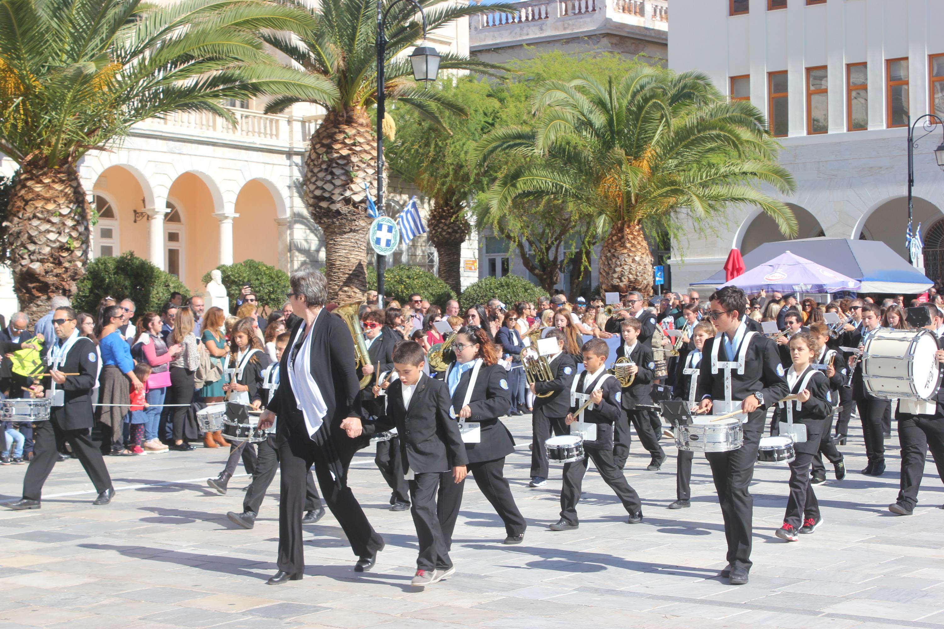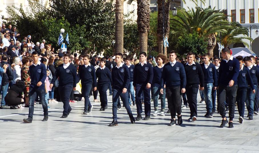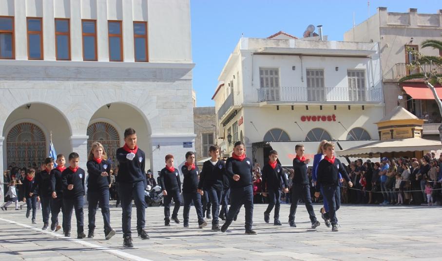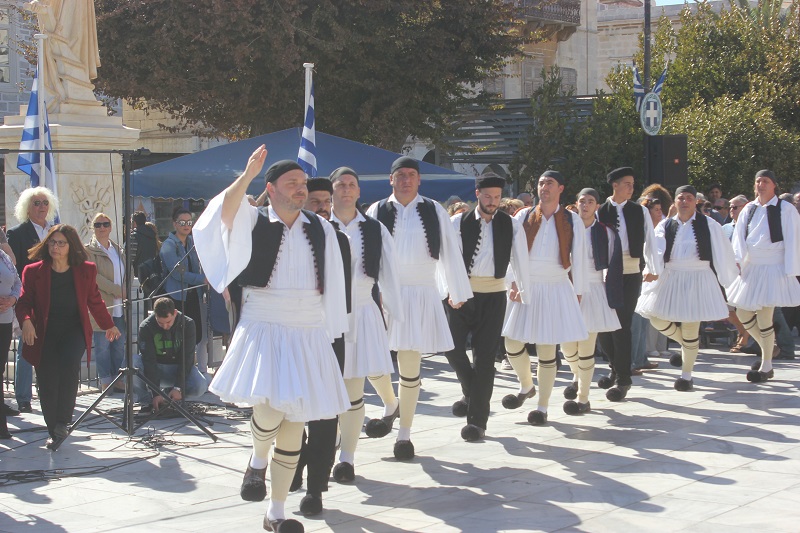 Μετά την στεφάνωση στα ηρώα της Ερμούπολης, που πραγματοποιήθηκε το Σάββατο, 27 Οκτωβρίου, σήμερα, Κυριακή, μαθητές, σπουδαστές, μέλη αθλητικών και πολιτιστικών συλλόγων, καθώς και το Τάγμα Εθνοφυλακής Ερμούπολης παρέλασαν ενώπιον του Βουλευτή Κυκλάδων Αντώνη Συρίγου, εκπροσώπων της τοπικής αυτοδιοίκησης, των στρατιωτικών αρχών και των σωμάτων ασφαλείας, φορέων, καθώς και πλήθους κόσμους.