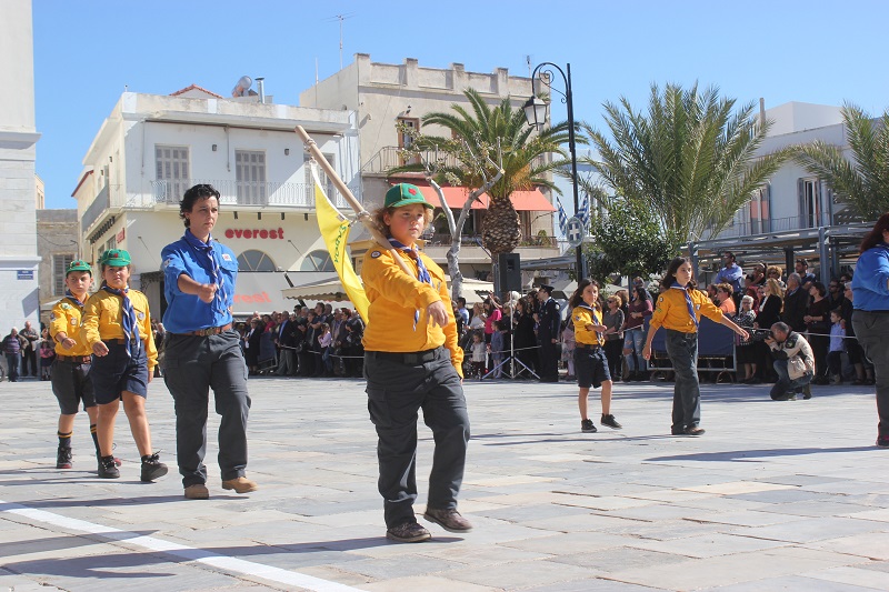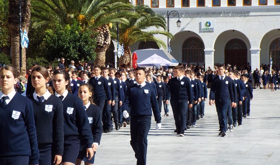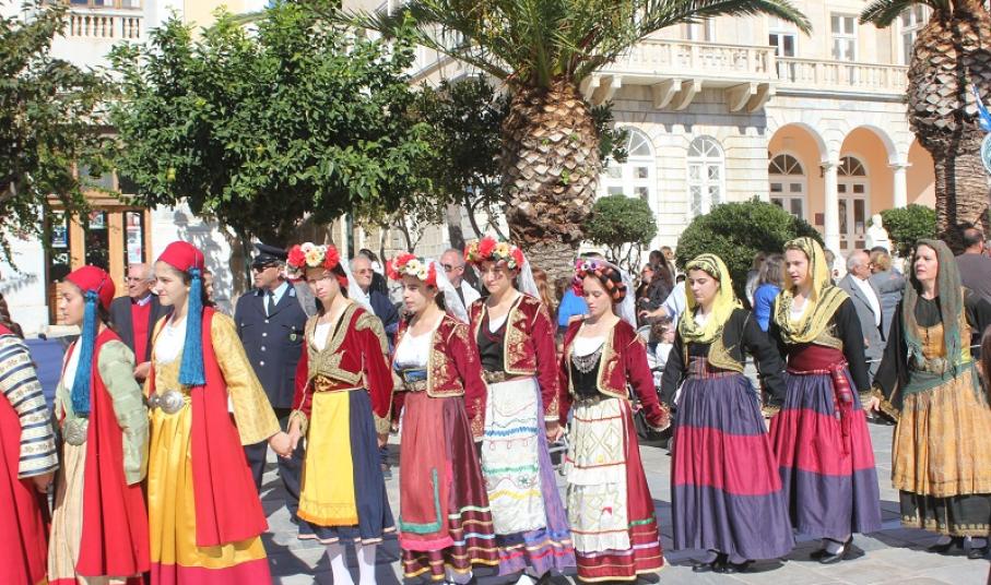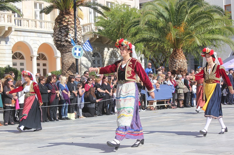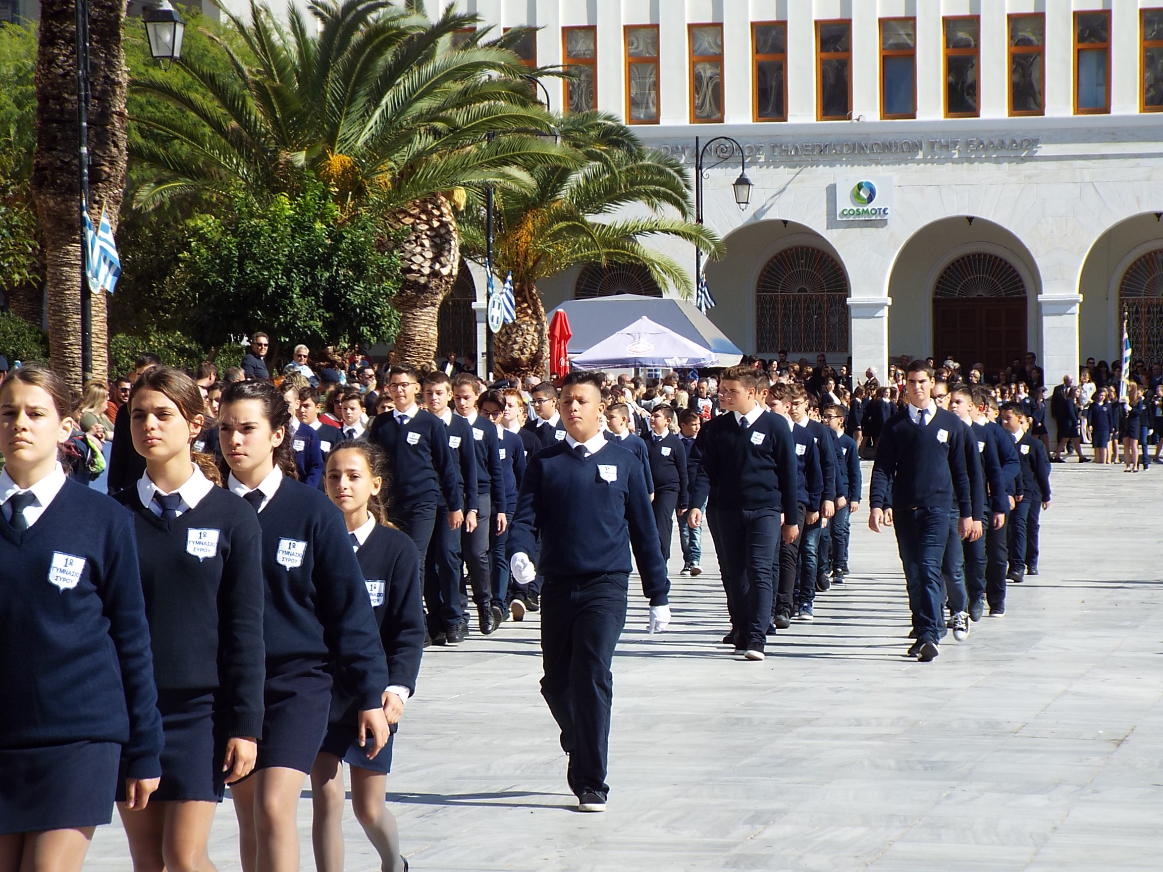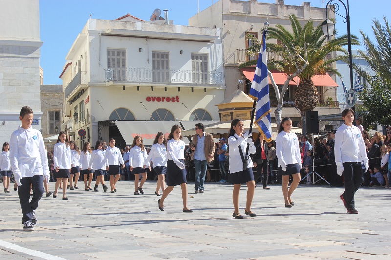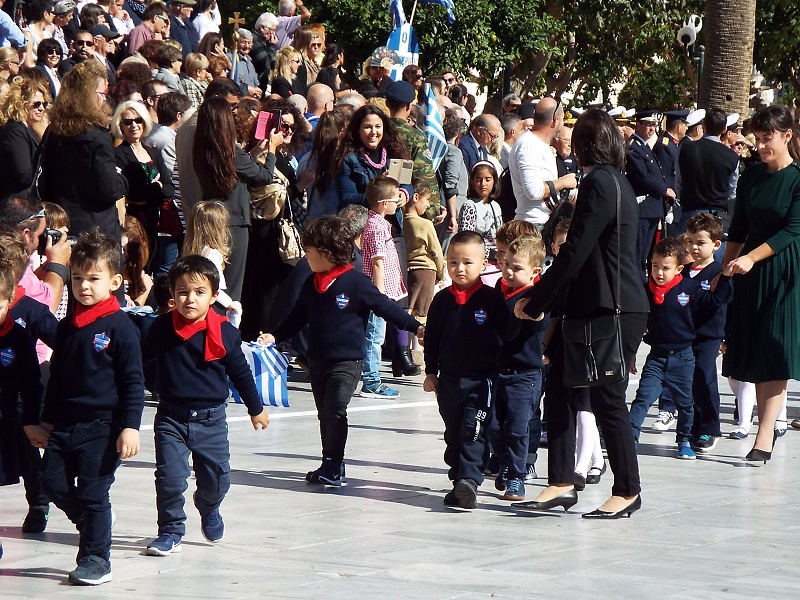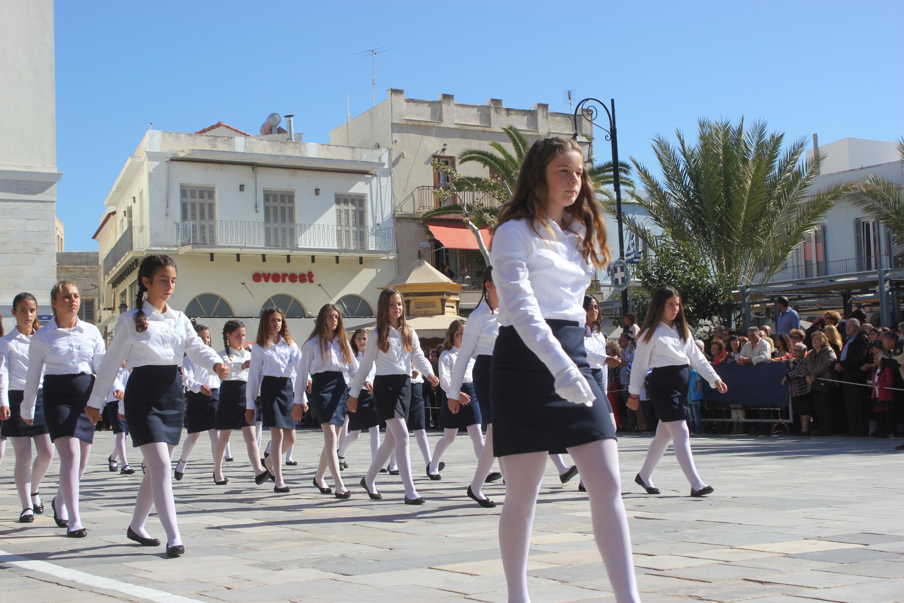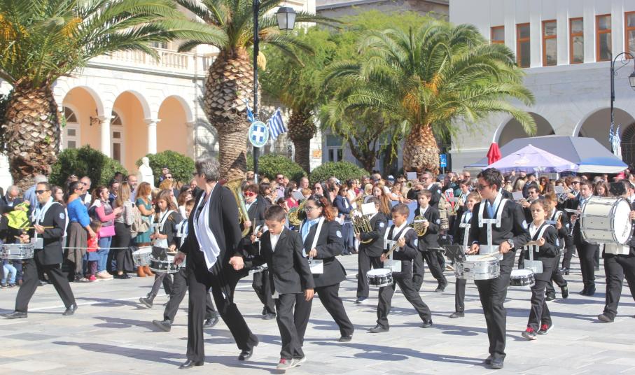 Μετά την στεφάνωση στα ηρώα της Ερμούπολης, που πραγματοποιήθηκε το Σάββατο, 27 Οκτωβρίου, σήμερα, Κυριακή, μαθητές, σπουδαστές, μέλη αθλητικών και πολιτιστικών συλλόγων, καθώς και το Τάγμα Εθνοφυλακής Ερμούπολης παρέλασαν ενώπιον του Βουλευτή Κυκλάδων Αντώνη Συρίγου, εκπροσώπων της τοπικής αυτοδιοίκησης, των στρατιωτικών αρχών και των σωμάτων ασφαλείας, φορέων, καθώς και πλήθους κόσμους.