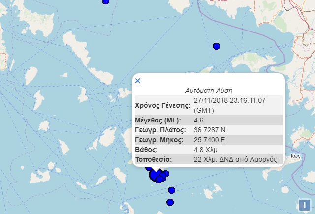 Περιοχή Επικέντρου: 230 km NΑ της Αθήνας, Θαλάσσιος χώρος 28 km ΝΔ της Αμοργού