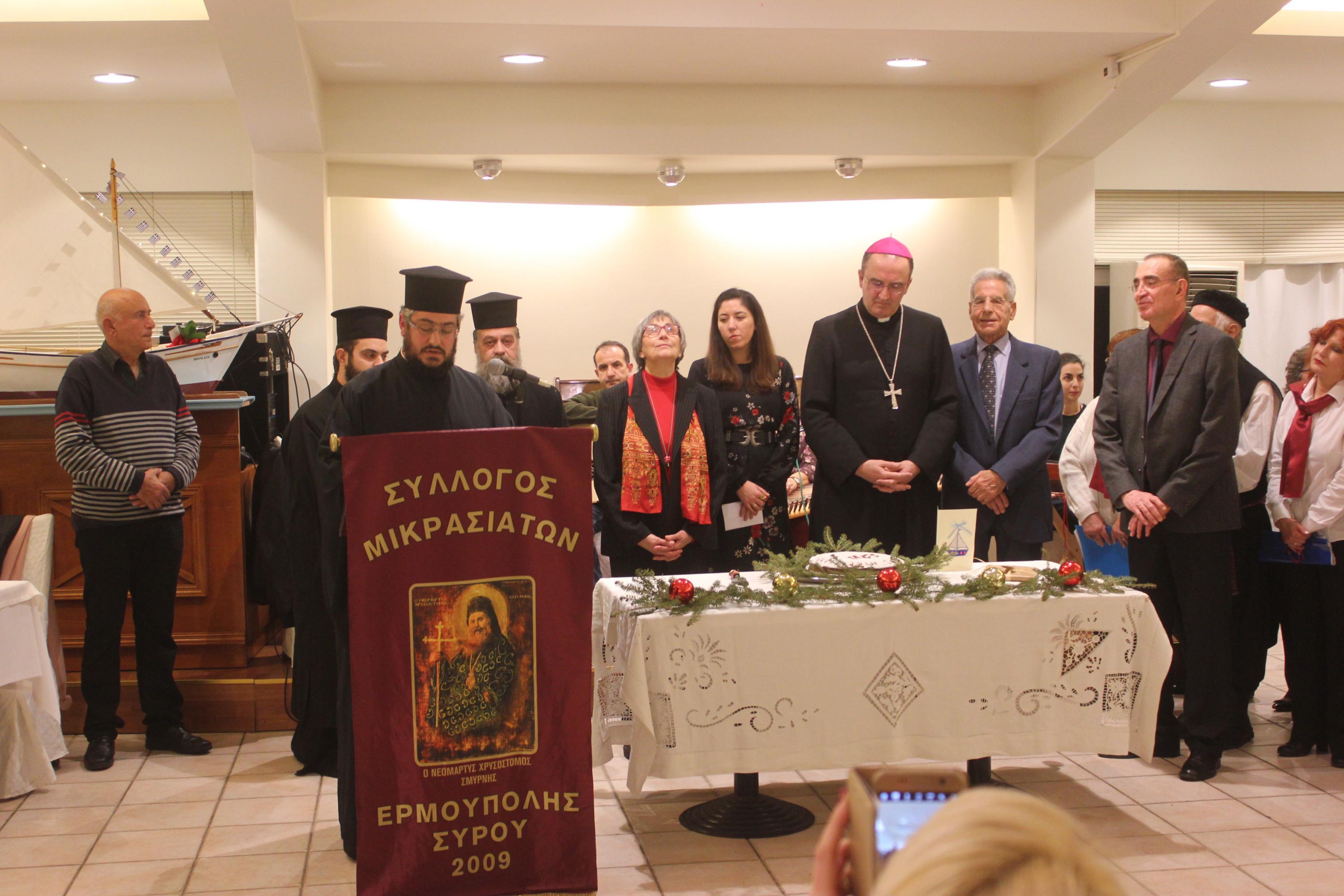 Ο πρόεδρος του Συλλόγου, Νικόλαος Λειβαδάρας, αφού καλωσόρισε τους παρευρισκόμενους, αναφέρθηκε στα έθιμα και τις συνήθειες της Μικρασιατικής οικογένειας κατά τη διάρκεια του δωδεκαημέρου των Χριστουγέννων. Στη συνέχεια, εξέφρασε την ικανοποίηση και τη συγκίνησή του για την αγάπη που επεφύλαξαν στη Στέγη Μικρασιατικής Μνήμης τόσο οι κάτοικοι όσο και οι επισκέπτες της Σύρου, μεταξύ αυτών και μαθητές αρκετών σχολείων από τη Βόρεια Ελλάδα και από άλλα μέρη της Ελλάδας.