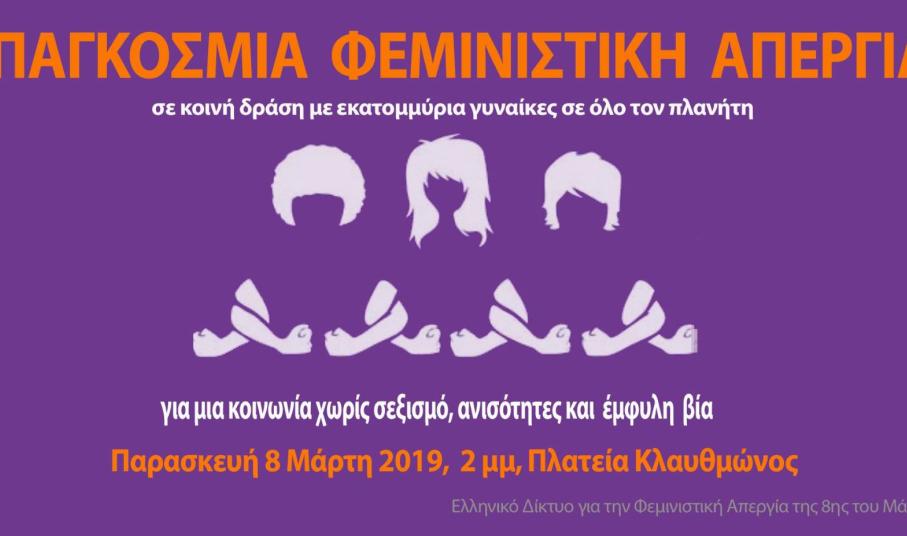 Φέτος, για πρώτη φορά, οργανώνεται στην Ελλάδα η Παγκόσμια Φεμινιστική Απεργία, η οποία ξεκίνησε το 2016, με πρωτοβουλία φεμινιστικών και γυναικείων οργανώσεων από όλο τον κόσμο. Το 2018 συμμετείχαν επίσημα 40 χώρες, ανάμεσα σε αυτές και η Ισπανία, όπου πραγματοποιήθηκε μια ιστορική απεργία, με τη συμμετοχή περισσότερων από 5 εκατομμύρια γυναικών.