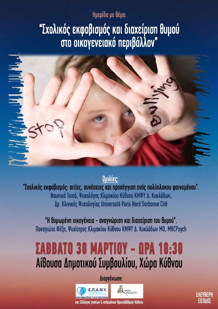 Η Κινητή Μονάδα Ψυχικής Υγείας Δυτικών Κυκλάδων, σε συνεργασία με  το Δήμο Κύθνου, διοργανώνει ημερίδα με θέμα «Σχολικός εκφοβισμός και διαχείριση θυμού στο οικογενειακό περιβάλλον» στις 30/03/2019  στην Κύθνο, στις 18:30 στην αίθουσα Δημοτικού Συμβουλίου, Χώρα Κύθνου.
