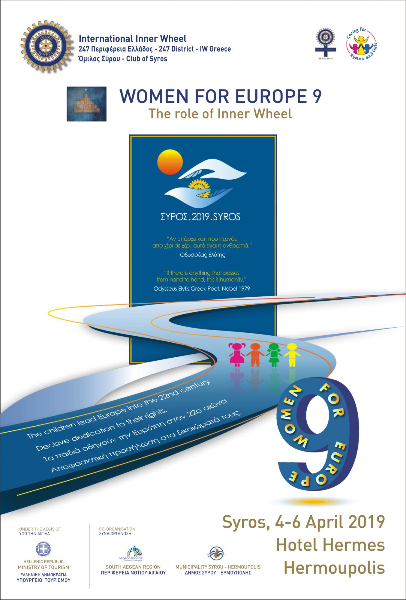 «To Πανευρωπαϊκό Συνέδριο του Inner Wheel «Women for Europe» είναι ένα διεθνές, κοινωνικό και πολιτιστικό πρόγραμμα που ξεκίνησε το 2008 στη Νάπολη της Ιταλίας και έχει στόχο να βελτιώσει τις ανθρώπινες ζωές και να δημιουργήσει ένα καλύτερο μέλλον τόσο σε ευρωπαϊκό, όσο και σε παγκόσμιο επίπεδο, δεδομένου ότι το Inner Wheel εκπροσωπείται στον ΟΗΕ. Η 247 Περιφέρεια Inner Wheel Ελλάδος στην οποία υπάγεται ο Όμιλος Σύρου, λαμβάνοντας υπόψη της την επιθυμία που εκφράσαμε, διεκδίκησε δυναμικά την ανάληψη της διοργάνωσης προβάλλοντας, μεταξύ άλλων, το επιχείρημα της πολιτιστικής κληρονομιάς και ταυτότητας του νησιού μας. Το θέμα του συνεδρίου επιλέχθηκε από τον Όμιλό μας μετά από την ανάληψη της διοργάνωσης. Σε κάθε περίπτωση όμως η θεματολογία όλων των προηγούμενων Women for Europe ήταν πάντοτε κοινωνικού και πολιτιστικού περιεχομένου. Όλες εμείς, οι γυναίκες του Ομίλου Σύρου μοιραζόμασταν για αρκετά χρόνια το όνειρο μιας τέτοιας διοργάνωσης. Υπερήφανες πρέσβειρες των αξιών που πρεσβεύει ο παγκόσμιος Οργανισμός που εθελοντικά υπηρετούμε, αλλά ταυτόχρονα και υπερήφανες πρέσβειρες της Σύρου μας, διεκδικήσαμε σθεναρά τη διοργάνωση αυτή, θέλοντας να προβάλουμε το νησί μας στην Ευρώπη συμβάλλοντας παράλληλα στην οικονομική του ανάπτυξη με μία μεγάλη κοινωνική και πολιτιστική εκδήλωση παγκόσμιου ενδιαφέροντος».