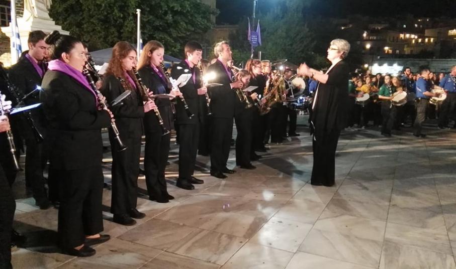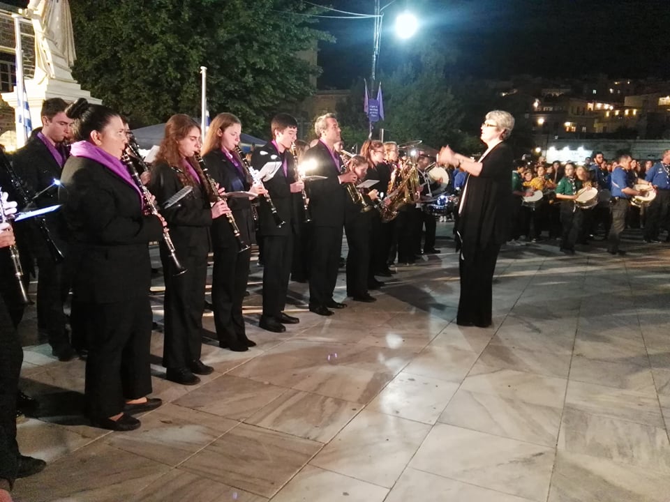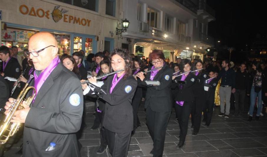 Τη λιτάνευση πλαισίωσε η Φιλαρμονική του Δήμου Σύρου – Ερμούπολης, παιανίζοντας πένθιμα εμβατήρια, υπό τη διεύθυνση της αρχιμουσικού Alice Labarche.