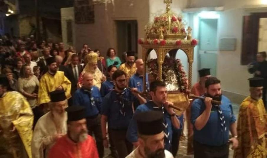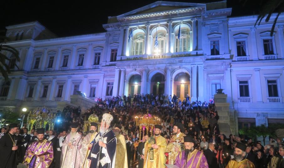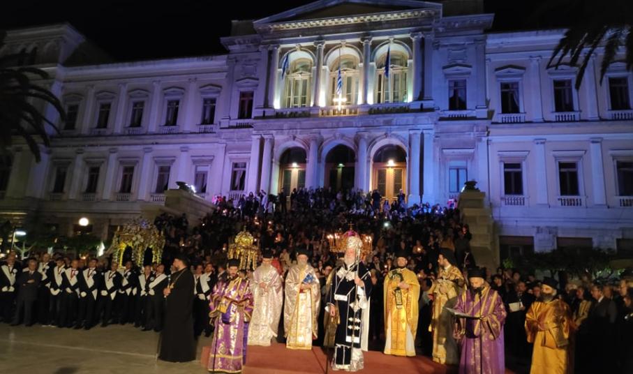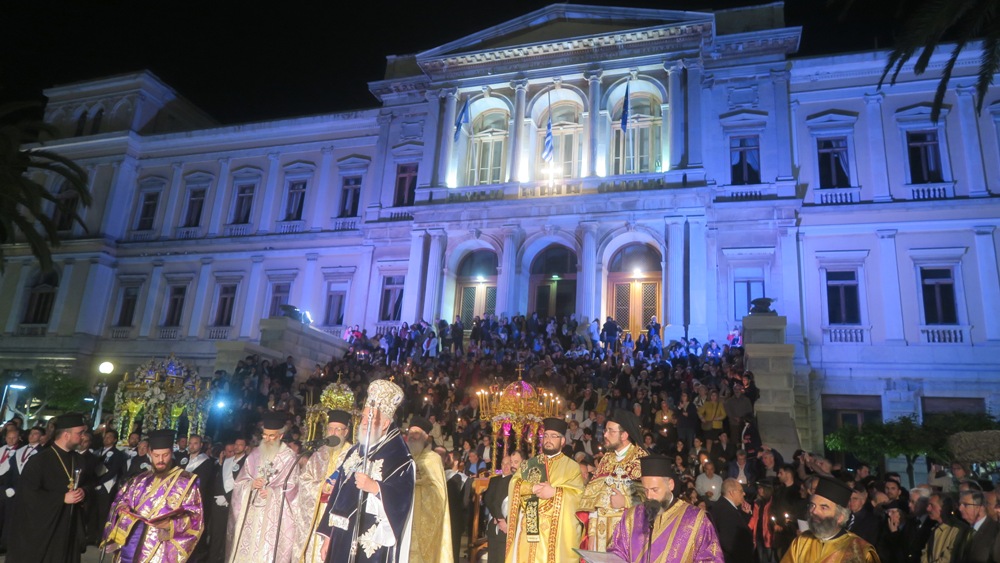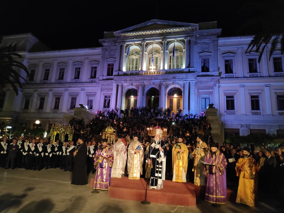 Το βράδυ της Μεγάλης Παρασκευής, ο Μητροπολίτης Σύρου προέστη της Ακολουθίας του Επιταφίου Θρήνου στον Ιερό Μητροπολιτικό Ναό της Μεταμορφώσεως του Σωτήρος και ακολούθως ετέθη επικεφαλής της λιτανευτικής πομπής του ιερού Επιταφίου προς την ιστορική Πλατεία Μιαούλη Ερμουπόλεως.