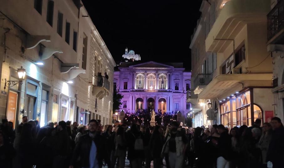 Πίστη, ελπίδα, γαλήνη, αγαλλίαση αλλά και θαυμασμός για την ομορφιά της πρωτεύουσας των Κυκλάδων, κατέκλυσαν λίγη ώρα αργότερα το ιστορικό κέντρο της Ερμούπολης και περιέβαλαν το επιβλητικό και εντυπωσιακά φωταγωγημένο Δημαρχιακό Μέγαρο της Σύρου, έμπροσθεν του οποίου πραγματοποιήθηκε η μεγαλοπρεπής συνάντηση των Επιταφίων των Ιερών Ναών Μεταμορφώσεως του Σωτήρος, Κοιμήσεως της Θεοτόκου και Αγίου Νικολάου.