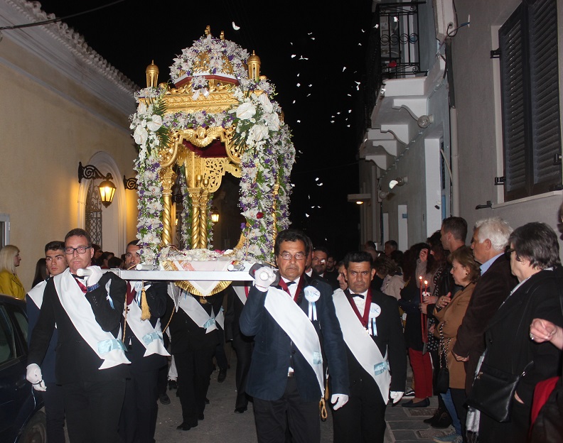 Προηγήθηκε η περιφορά του Επιταφίου του Ιερού Ναού Ευαγγελιστρίας Ερμουπόλεως, της Καθολικής Εκκλησίας, η οποία λάμπρυνε τους δρόμους του ιστορικού κέντρου. Πλήθος πιστών κατέκλυσαν το ναό και τους εξωτερικούς χώρους, για να παρακολουθήσουν την Ακολουθία των Αγίων Παθών του Κυρίου, προεξάρχοντος του Καθολικού Επισκόπου Σύρου Σεβ. π. Πέτρου Στεφάνου, μέσα σε κατανυκτική και συγκινητική ατμόσφαιρα υπό τους ύμνους που έψαλε η πολυφωνική χορωδία της ενορίας. Ανάμεσά τους ο Βουλευτής Κυκλάδων Αντώνης Συρίγος, αλλά και εκπρόσωποι της τοπικής αυτοδιοίκησης της Σύρου, οι οποίοι συμμετείχαν και στην περιφορά του Επιτάφιου, βασταζόμενου στους ώμους νέων. Η λιτάνευση του Επιταφίου τράβηξε τα βλέμματα εκατοντάδων επισκεπτών που είχαν συγκεντρωθεί στην πλατεία Μιαούλη απ’ όπου διέρχεται. Υπογραμμίζεται πως, ο Σεβασμιώτατος π. Πέτρος δεν συμμετείχε στην περιφορά προκειμένου να τελέσει την ακολουθία των Αγίων Παθών στον Καθεδρικό Ναό Αγίου Γεωργίου στην Άνω Σύρο.
