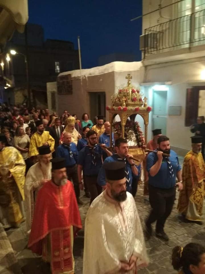 Με ξεχωριστή λαμπρότητα τελέστηκε το απόγευμα της Κυριακής του Πάσχα ο Εσπερινός της Αγάπης στον εορτάζοντα Ιερό Ναό Αγίου Γεωργίου με τη συμμετοχή όλων των εφημερίων της Σύρου, αλλά και των προσκόπων του νησιού με τα ενήλικα στελέχη να φέρουν την εικόνα και να παίζουν τύμπανα μαζί με τα παιδιά ή να κρατούν θυμιατά και εξαπτέρυγα.