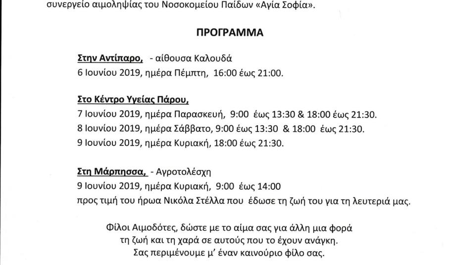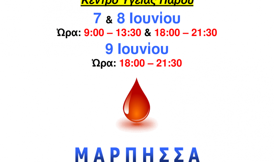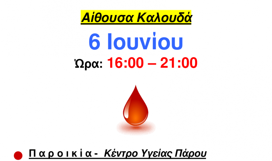 Ο Σύλλογος Εθελοντών Αιμοδοτών Πάρου - Αντιπάρου "Μαρία Ναυπλιώτη" προσκαλεί όλα τα μέλη του στην εαρινή αιμοδοσία που θα πραγματοποιηθεί από το συνεργείο αιμοληψίας του Νοσοκομείου Παίδων "Αγία Σοφία".