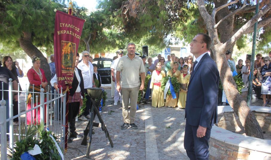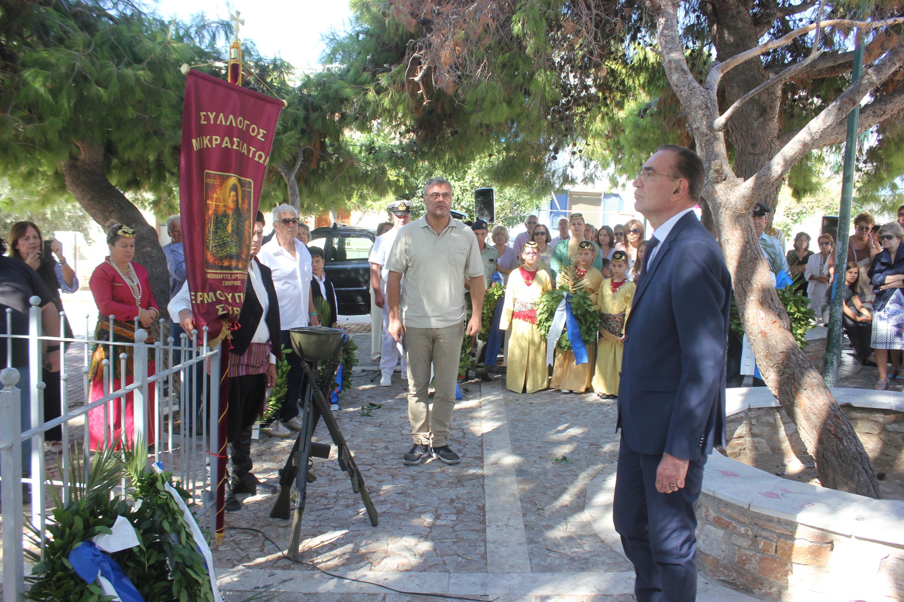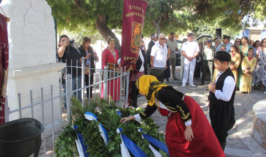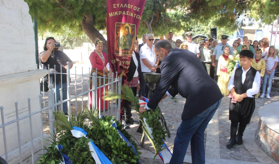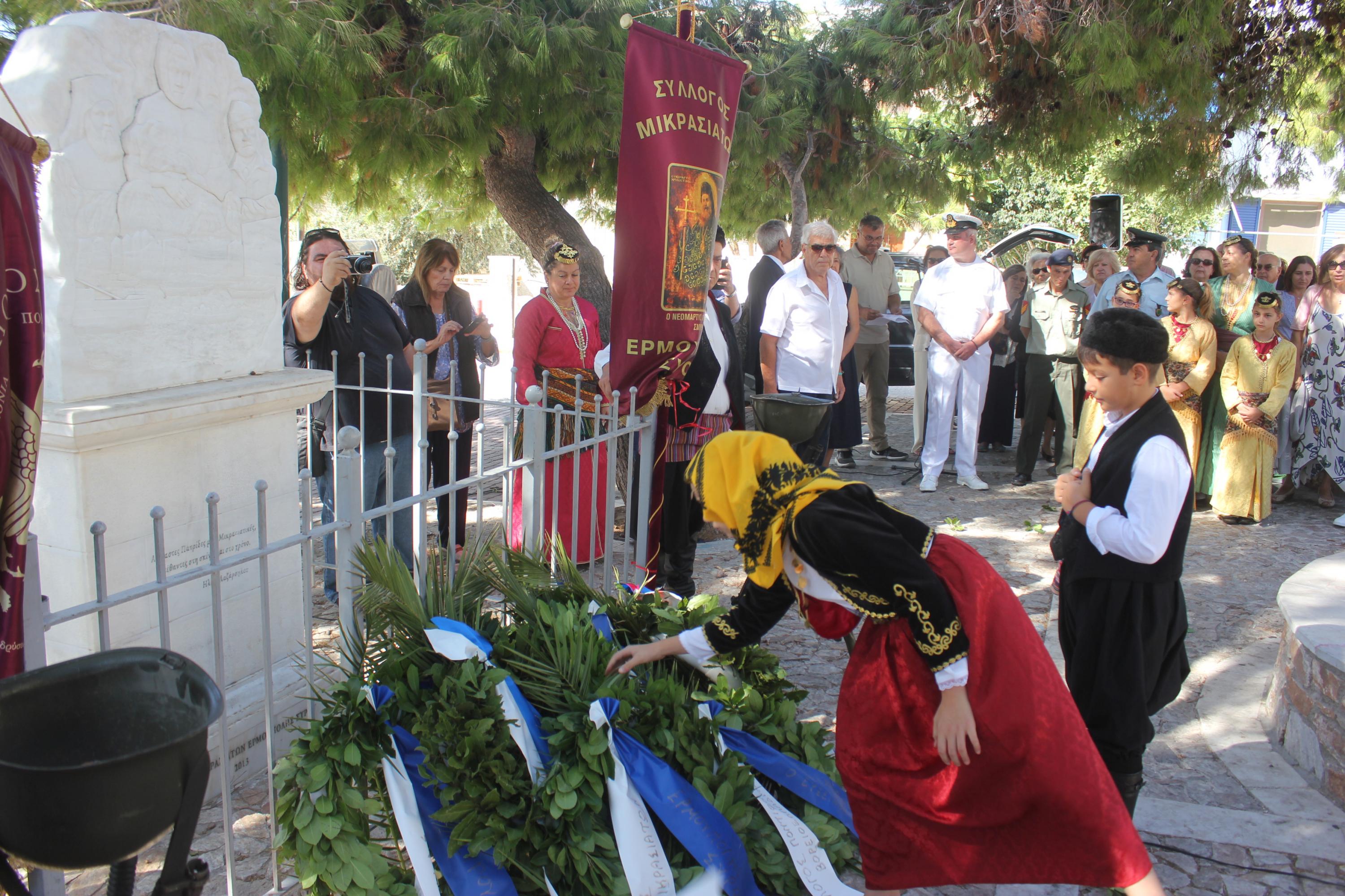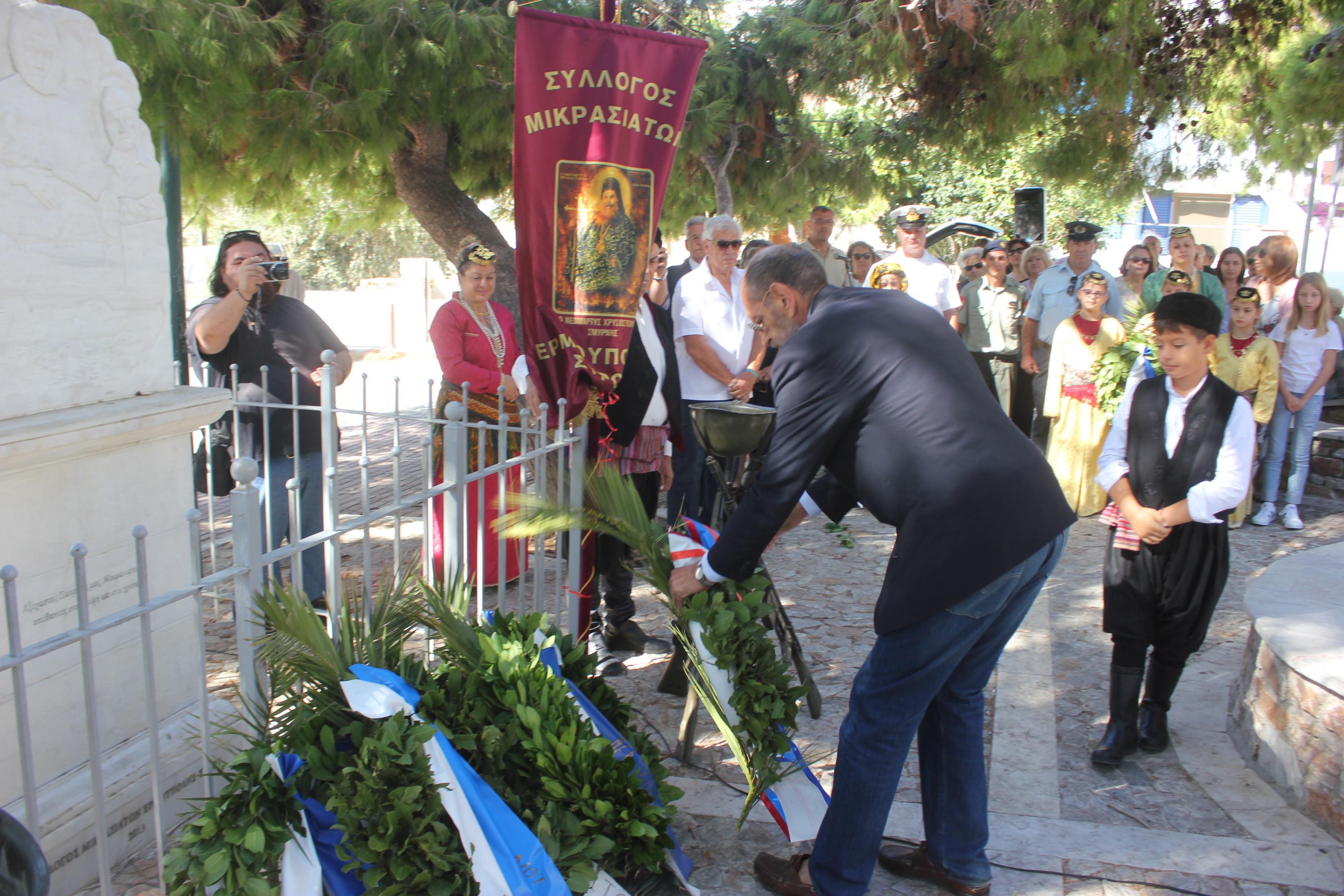 Μετά από την εκφώνηση του Πανηγυρικού της Ημέρας, τελέστηκε Επιμνημόσυνη Δέηση στο Μνημείο Μικρασιατικής Μνήμης στην περιοχή του προσφυγικού συνοικισμού του Ξηροκάμπου όπου πραγματοποιήθηκε κατάθεση στεφάνων από τον Αντιπεριφερειάρχη Κυκλάδων, τον Δήμαρχο Σύρου – Ερμούπολης, Νίκο Λειβαδάρα, την Αρμενική Εθνική Επιτροπή Ελλάδας, εκπροσώπους του στρατού και των σωμάτων ασφαλείας, τον Σύλλογο Μικρασιατών Σύρου και τον Σύλλογο Ποντίων και Βορειοελλαδιτών Σύρου.