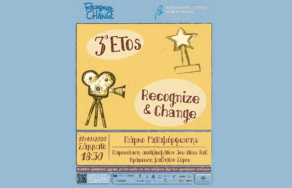 Η Βαρδάκειος Σχολή Ερμούπολης με μεγάλη χαρά προσκαλεί στην εκδήλωση της, για την παρουσίαση του 3ου έτους του έργου Recognize and Change, η οποία περιλαμβάνει και τη βράβευση μαθητών της Σύρου που διακρίθηκαν στη δημιουργία βίντεο στο πλαίσιο εργαστηρίων με θέμα "η βία ως συνέπεια των διακρίσεων και της διαφορετικότητας".