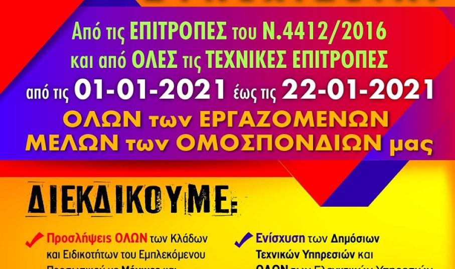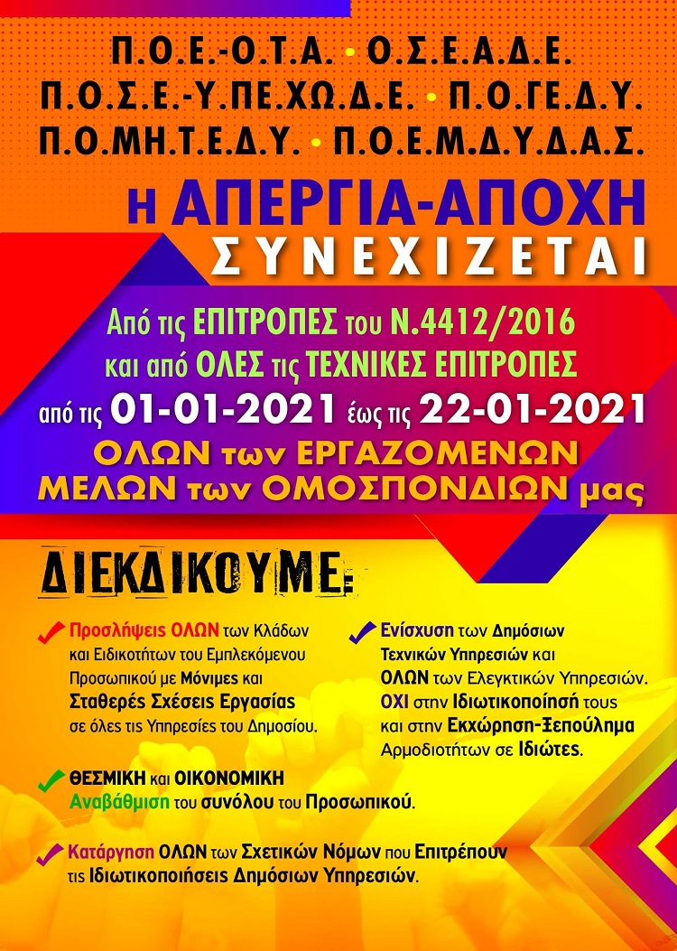 Οι συνυπογράφουσες Ομοσπονδίες σε συνέχεια της κοινής ανακοίνωσης 7 Ομοσπονδιών στις 12/11/2020 , του από 23/11/2020 Εξώδικου μας, με το οποίο προκηρύξαμε Απεργία – Αποχή από το ΜηΜΕΔ και όλες τις Επιτροπές του Ν.4412/16 και άλλες Τεχνικές Επιτροπές, αλλά και άλλων κοινών μας δράσεων ( κοινή Συνέντευξη Τύπου, κοινή Στάση Εργασίας στις 8/12/2020 και συνάντηση με αντιπροσωπείες κομμάτων) και κατόπιν αποφάσεων από τα αρμόδια Όργανα μας, αποφασίζουμε τη συνέχιση της Απεργίας – Αποχής και για το διάστημα 1/1/2021 έως και 22/1/2021, όπως μας δίνει το δικαίωμα το από 23/11/2020 κοινό μας Εξώδικο.