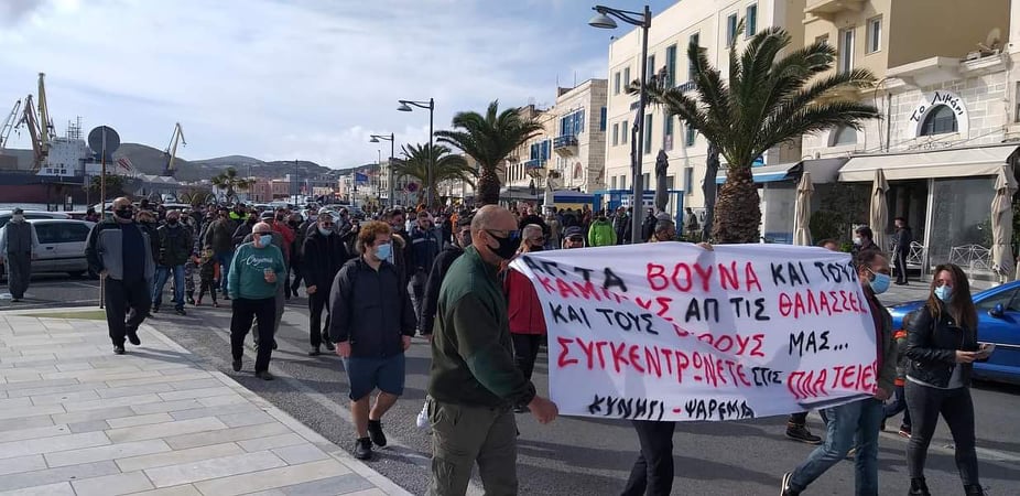 Αμέσως μετά την προγραμματισμένη συγκέντρωση στην πλατεία Μιαούλη, ακολούθησε πορεία στο κέντρο της πόλης. Κυνηγοί και αλιείς ζητούν από την κυβέρνηση την άρση της απαγόρευσης, υπογραμμίζοντας ότι και οι δύο κλάδοι έχουν βρεθεί σε αδιέξοδο.