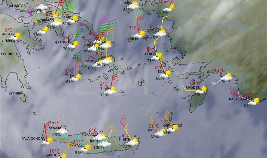 Για σήμερα, Τρίτη, η Εθνική Μετεωρολογική Υπηρεσία τονίζει πως χιονόνερο και χιονοπτώσεις, κατά τόπους πυκνές, θα σημειωθούν στις Σποράδες, την ανατολική Στερεά, την Εύβοια, τα νησιά του βορείου και ανατολικού Αιγαίου στις Κυκλάδες και την Κρήτη. Οι άνεμοι θα πνέουν βιορειοανατολικοί 7-9 και τοπικά 10 μποφόρ στο Αιγαίο. Πιο συγκεκριμένα για τις Κυκλάδες, η πρόγνωση αναφέρεται σε νεφώσεις με τοπικές βροχές ή χιονόνερο και χιονοπτώσεις στα ορεινά και ημιορεινά, ενώ η θερμοκρασία δεν πρόκειται να ξεπεράσει τους 6 βαθμούς Κελσίου.
