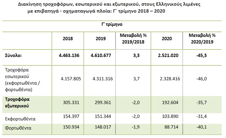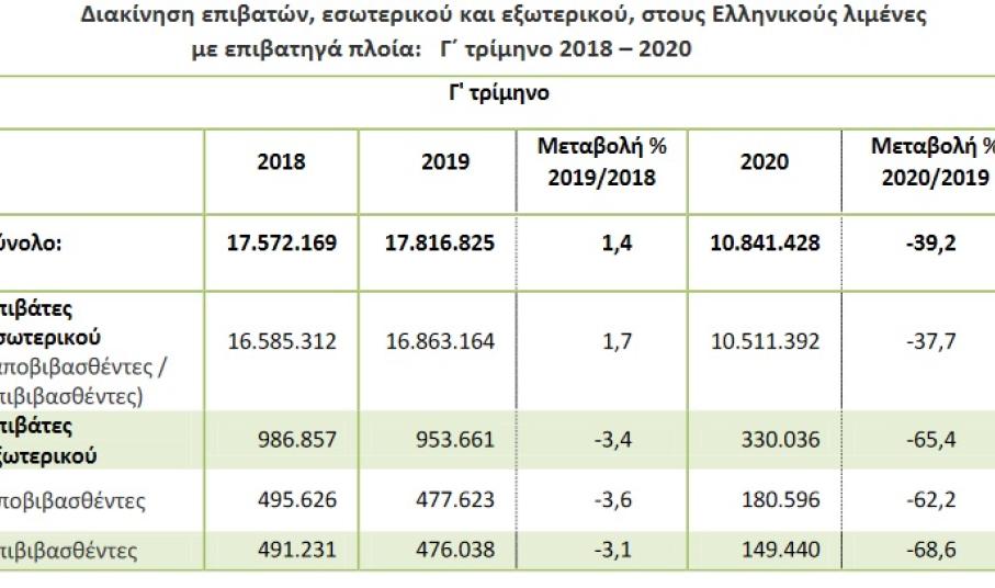 Η συνολική διακίνηση επιβατών στους Ελληνικούς λιμένες το γ΄ τρίμηνο 2020, σε σύγκριση με το γ΄ τρίμηνο του 2019, παρουσίασε μείωση κατά 39,2%, ενώ κατά την αντίστοιχη σύγκριση του γ΄ τριμήνου 2019 προς το γ΄ τρίμηνο 2018 παρατηρήθηκε αύξηση κατά 1,4%.
