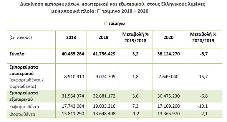 Η συνολική διακίνηση εμπορευμάτων στους Ελληνικούς λιμένες το γ΄ τρίμηνο 2020, σε σύγκριση με το γ΄ τρίμηνο του 2019, παρουσίασε μείωση κατά 8,7%, ενώ κατά την αντίστοιχη σύγκριση του γ΄ τριμήνου 2019 προς το γ΄ τρίμηνο 2018 παρατηρήθηκε αύξηση κατά3,2%.
