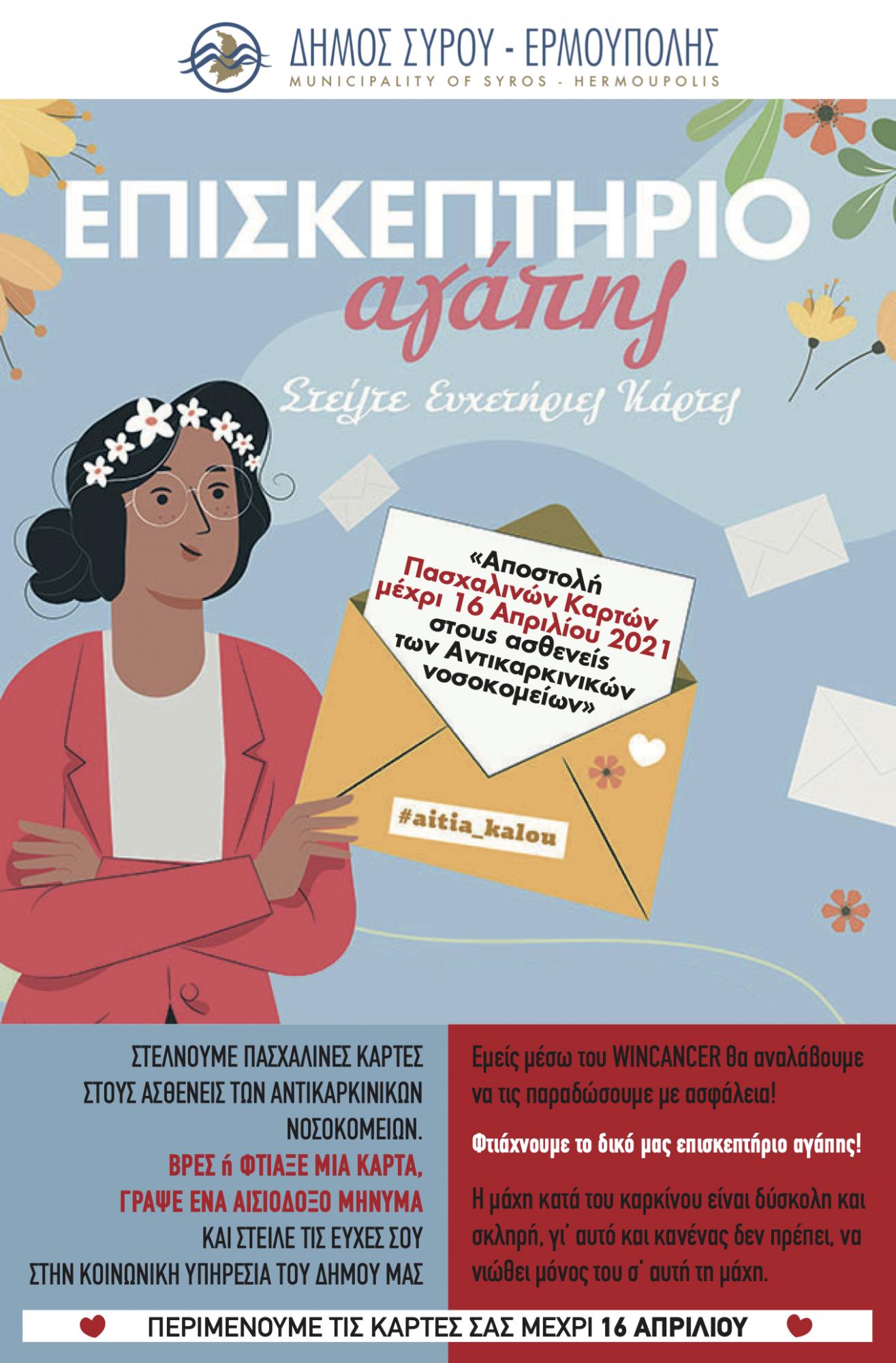 Βρείτε ή φτιάξτε μια κάρτα, γράψτε ένα αισιόδοξο μήνυμα και στείλτε τις ευχές σας στην Κοινωνική Υπηρεσία του Δήμου Σύρου - Ερμούπολης μέχρι τις 16 Απριλίου 2021. Μέσω του WINCANCER θα αναλάβουμε να παραδώσουμε τις ευχές σας με ασφάλεια.