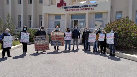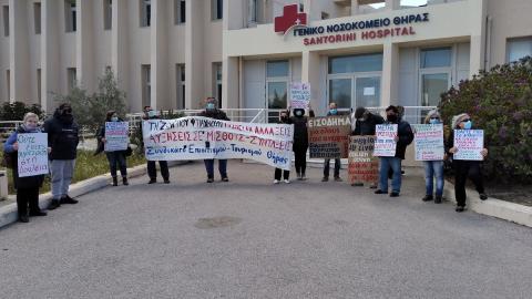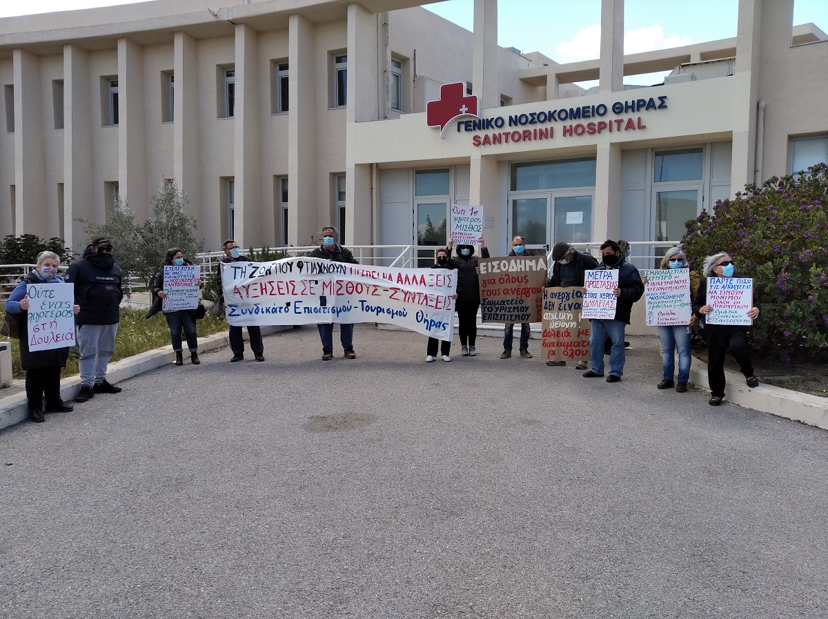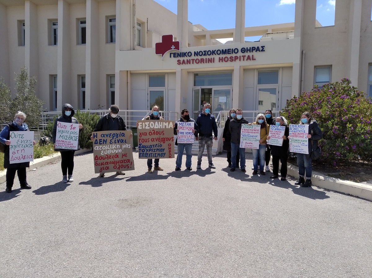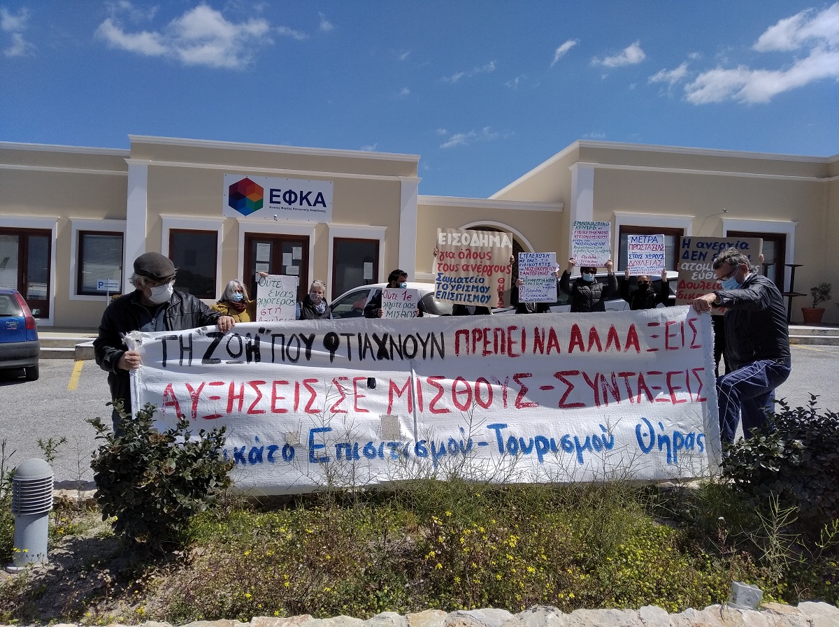 Στη Σαντορίνη πραγματοποιήθηκε κινητοποίηση έξω από τον ΕΦΚΑ Θήρας, στην οποία καλούσε το Συνδικάτο Επισιτισμού Τουρισμού και Συναφών Επαγγελμάτων Επαρχίας Θήρας και την οποία στήριξε και η Ομοσπονδία Γυναικών Ελλάδας. Παραδόθηκαν ψηφίσματα στη διοίκηση του ΕΦΚΑ και στο Δήμο Θήρας, ενώ η κινητοποίηση συνεχίστηκε στο Γενικό Νοσοκομείο Θήρας με τη συμμετοχή αντιπροσωπείας εργαζομένων του νοσοκομείου, με αιτήματα για ενίσχυση των αγροτικών ιατρείων, στελέχωση με μόνιμο προσωπικό του νοσοκομείου, παράταση των συμβάσεων των επικουρικών εργαζομένων που εν μέσω πανδημίας απολύονται.