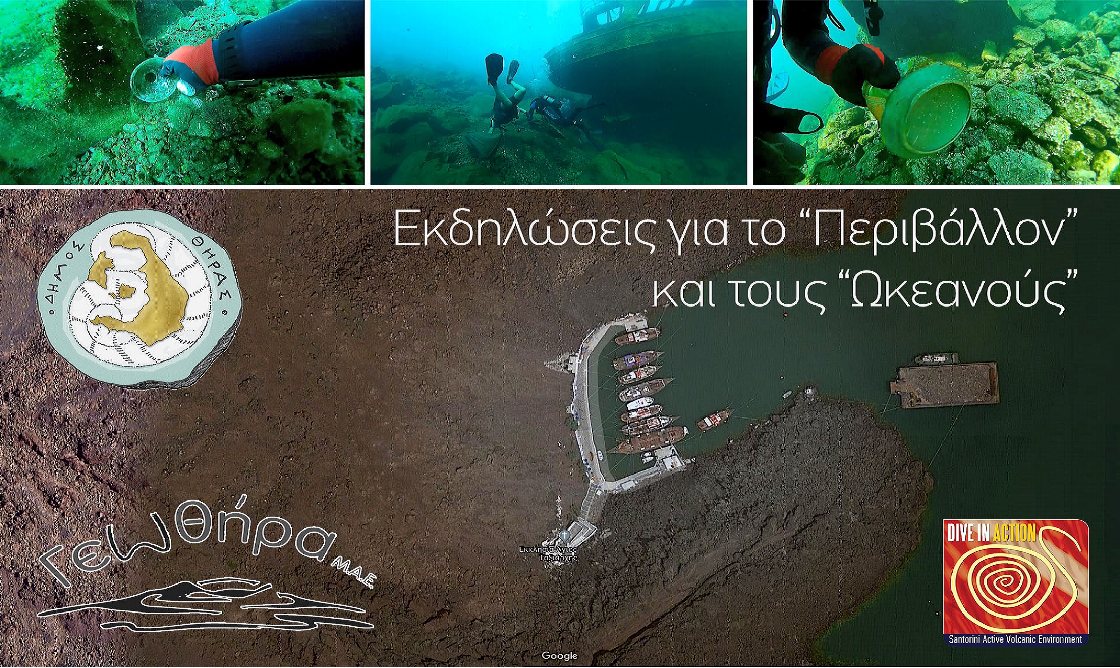 Με τρεις εκδηλώσεις αφιερωμένες στην Παγκόσμια Ημέρα, Περιβάλλοντος το Σάββατο 5 Ιουνίου 2021, και Ημέρα των Ωκεανών την Τρίτη 8 Ιουνίου 2021, συνεχίζει τις δράσεις της η περιβαλλοντική οργάνωση Dive In Action, στα πλαίσια της συνεργασίας με τον Δήμο Θήρας για τη μείωση του περιβαλλοντικού αποτυπώματος και των περιορισμό της "πλαστικής" ρύπανσης.
