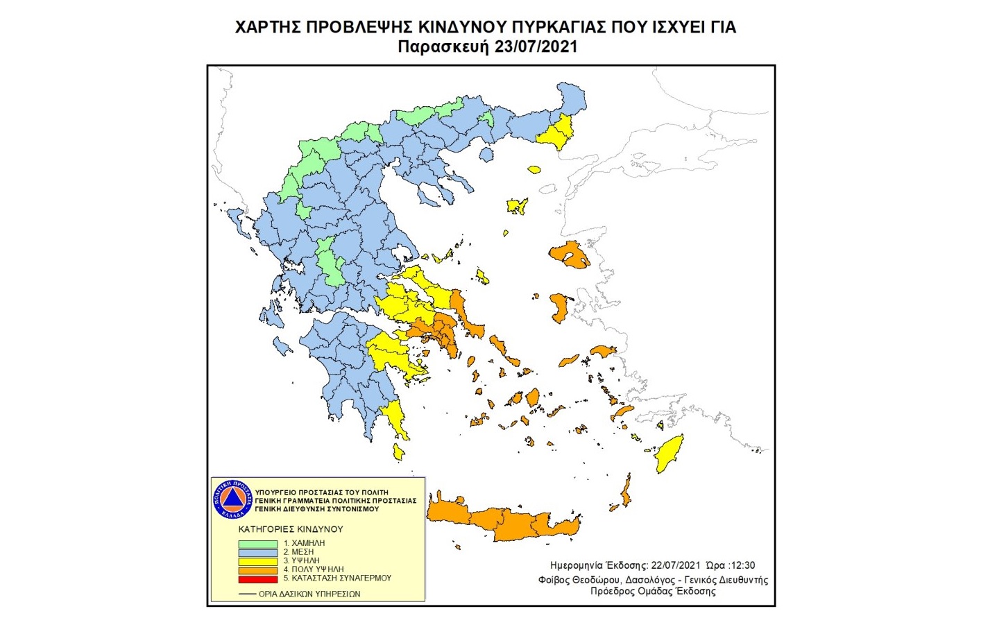 Η Αυτοτελής Διεύθυνση Πολιτικής Προστασίας της Περιφέρειας Νοτίου Αιγαίου ενημερώνει ότι την Παρασκευή 23-7-2021, σύμφωνα με τον Ημερήσιο Χάρτη Πρόβλεψης Κινδύνου Πυρκαγιάς που συντάσσει η Διεύθυνση Σχεδιασμού και Αντιμετώπισης Έκτακτων Αναγκών της Γενικής Γραμματείας Πολιτικής Προστασίας, ο κίνδυνος για την εκδήλωση πυρκαγιών στην Περιφέρεια Νοτίου Αιγαίου - Π.Ε. Κυκλάδων και Π.Ε. Δωδεκανήσου (εκτός Π.Ε. Ρόδου), είναι πολύ υψηλός (Κατηγορία κινδύνου 4) και όλες οι αρμόδιες υπηρεσίες βρίσκονται σε κατάσταση αυξημένης ετοιμότητας-επιφυλακής.