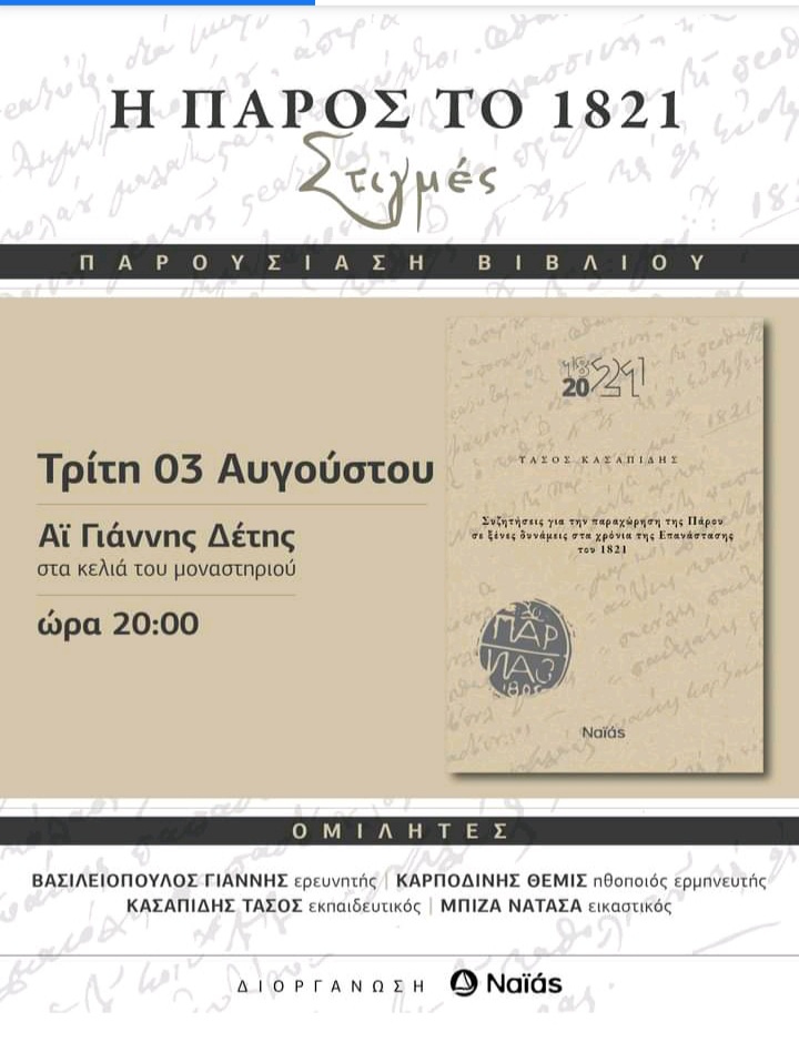 Η παρουσίαση του βιβλίου του Τάσου ΚΑΣΑΠΙΔΗ "ΣΥΖΗΤΗΣΕΙΣ για την παραχώρηση της Πάρου σε ξένες δυνάμεις στα χρόνια της επανάστασης του 1821" θα πραγματοποιηθεί στα κελιά του μοναστηριού του Άη Γιάννη Δέτη στο Πάρκο Πάρου στις 3 Αυγούστου, 2021.