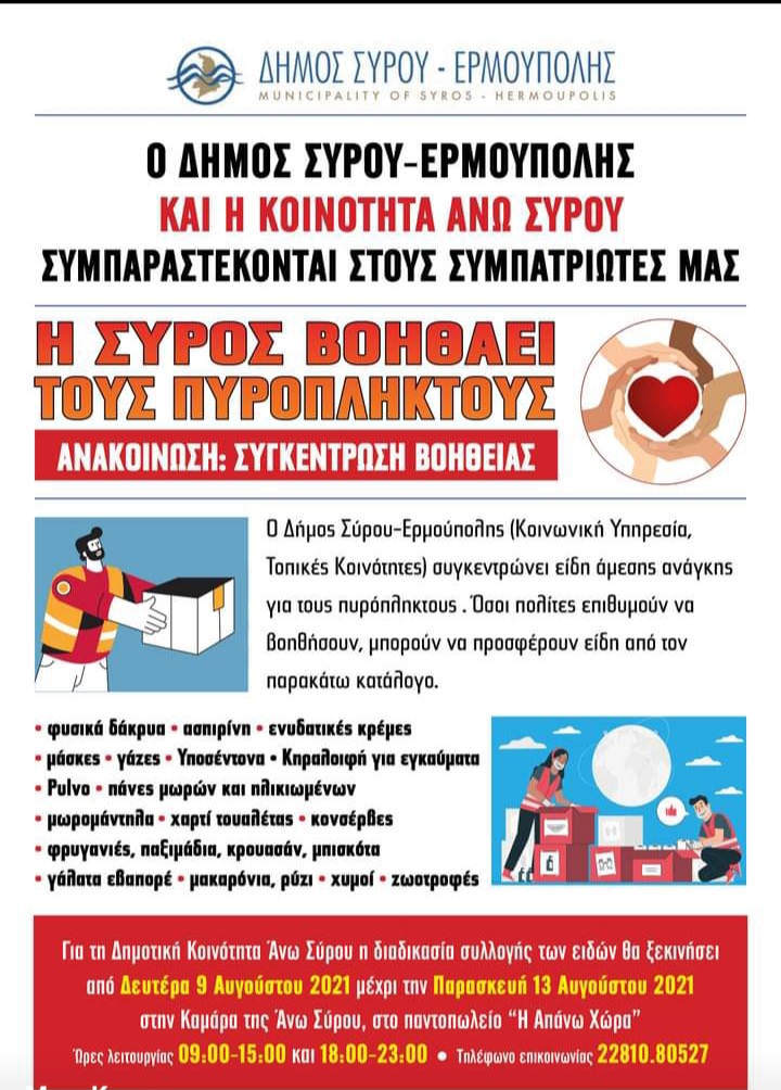 Για τον οικισμό της Άνω Σύρου - Επάνω Μεριάς θα συλλέγονται στο παντοπωλείο η "ΑΠΑΝΩ ΧΩΡΑ" του κ.Μαρίνου Καπέλλα καθημερινώς από τη Δευτέρα 9 Αυγούστου έως και την Παρασκευή 13 Αυγούστου 2021 κατά τις εξής ώρες 09:00 -15:00 και 18:00 - 23:00