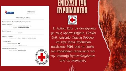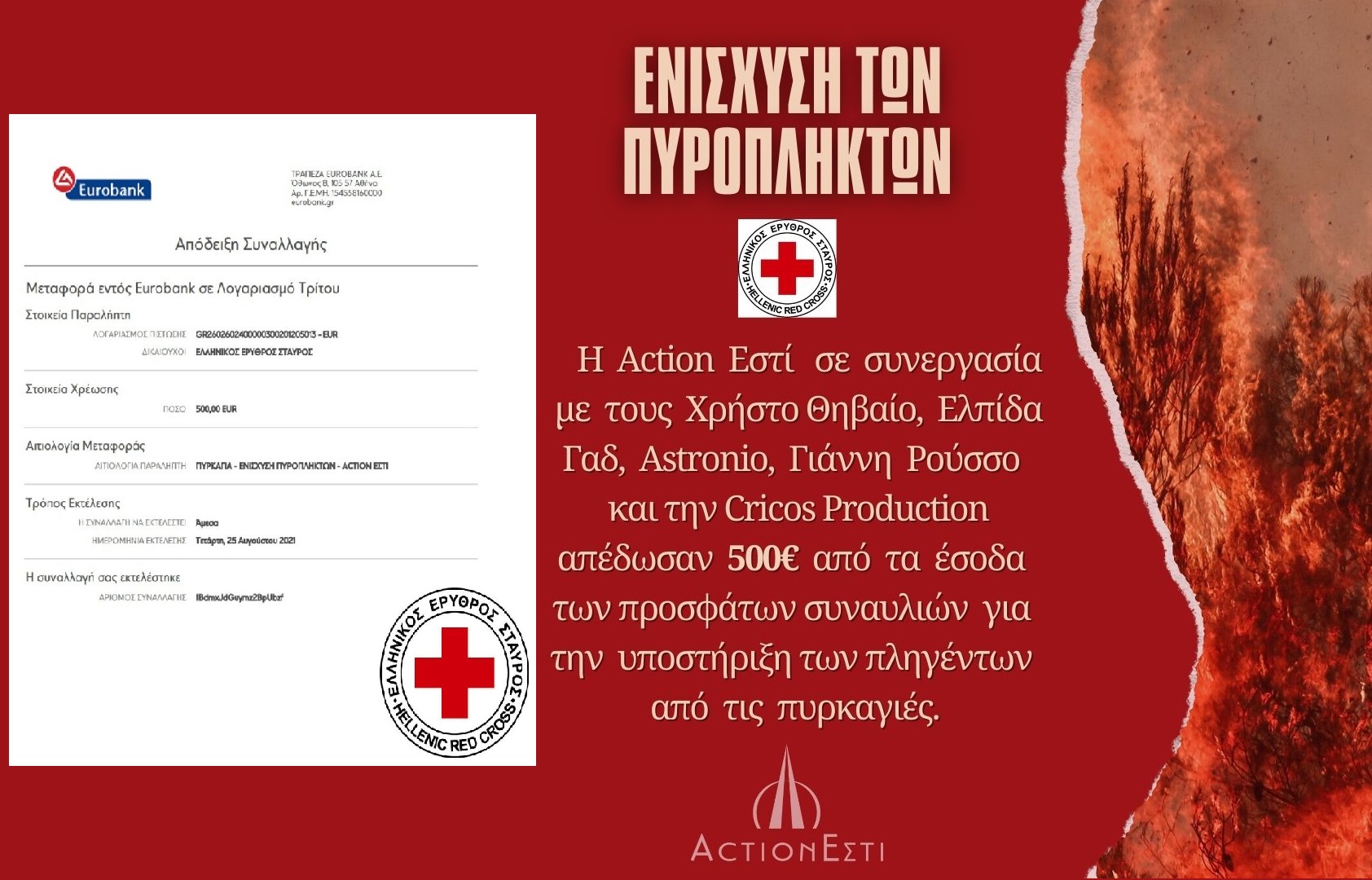 Η εταιρεία Action Εστί | Events & Artist Management, υλοποιεί τη δέσμευση της και ενισχύει το έργο του Ερυθρού Σταυρού για την υποστήριξη των πυρόπληκτων αλλά και των οικόσιτων ζώων που έμειναν χωρίς στέγη, με στόχο να επουλώσουν τις πληγές που άφησαν πίσω οι καταστροφικές πυρκαγιές του 2021.