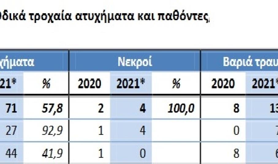 Η Ελληνική Στατιστική Αρχή (ΕΛΣΤΑΤ) ανακοινώνει τα προσωρινά1 στοιχεία της έρευνας για τα «Οδικά Τροχαία Ατυχήματα», μηνός Ιουλίου 2021. Ειδικότερα, τα οδικά τροχαία ατυχήματα, που συνέβησαν σε ολόκληρη τη χώρα και προκάλεσαν τοv θάνατο ή τον τραυματισμό ατόμων, αυξήθηκαν κατά 24,5% σε σύγκριση με τον αντίστοιχο μήνα του 2020 (1.223 τον Ιούλιο του 2021, έναντι 982 τον Ιούλιο του 2020).