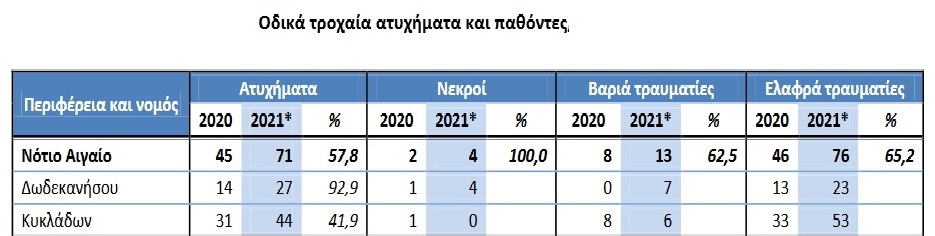 Από τα παθόντα πρόσωπα των οδικών τροχαίων ατυχημάτων, καταγράφηκαν 72 νεκροί, 84 βαριά τραυματίες και 1.371 ελαφρά τραυματίες, έναντι 57 νεκρών, 58 βαριά τραυματιών και 1.139 ελαφρά τραυματιών τον Ιούλιο του 2020, παρουσιάζοντας αύξηση κατά 26,3% σε νεκρούς, κατά 44,8% σε βαριά τραυματίες και κατά 20,4% σε ελαφρά τραυματίες.