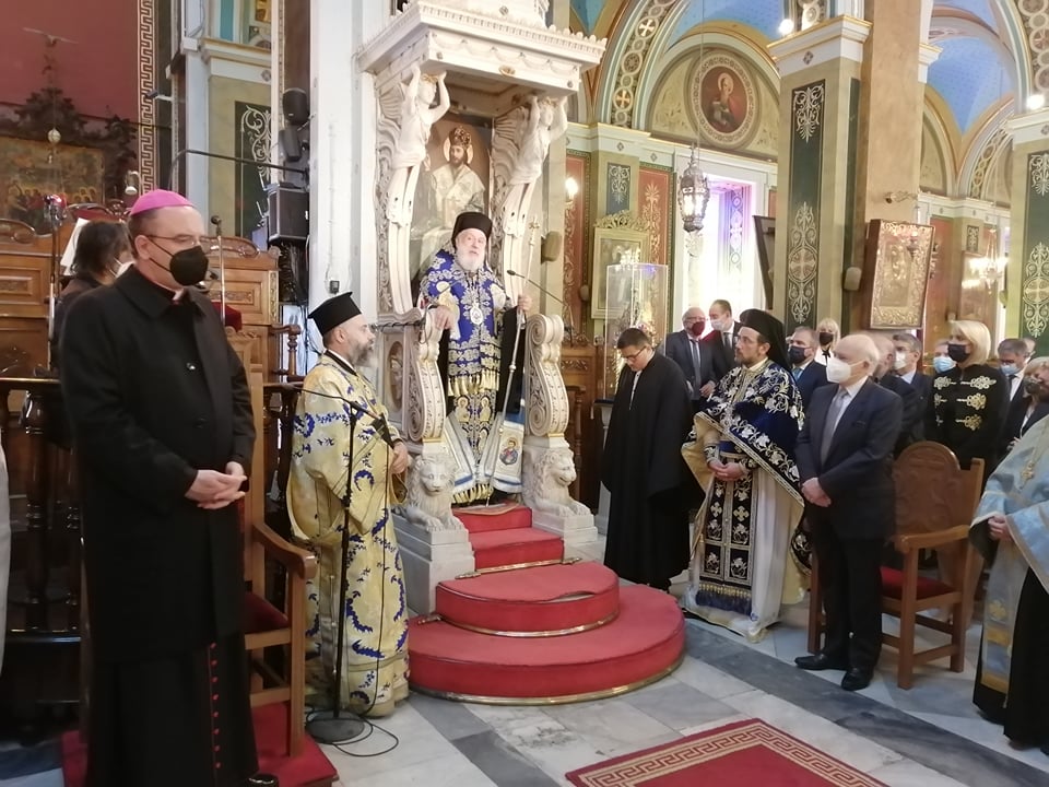 Ταυτόχρονα, παρουσία του Καθολικού Επισκόπου Σύρου Σεβ. π. Πέτρου Στεφάνου, του Γενικού Γραμματέα Επαγγελματικής Εκπαίδευσης, Κατάρτισης και Διά Βίου Μάθησης, Γεώργιου Βούτσινου, των βουλευτών Κυκλάδων, Γιάννη Βρούτση, Κατερίνας Μονογυιού, Φίλιππου Φόρτωμα, Νίκου Συρμαλένιου, εκπροσώπων των τοπικών αρχών, αλλά και αντιπροσωπειών της σχολικής κοινότητας της Σύρου, τελέστηκε στον Ιερό Ναό Αγίου Νικολάου, Επίσημη Δοξολογία, προεξάρχοντος του Σεβασμιωτάτου Μητροπολίτη Σύρου κ. Δωροθέου Β’.