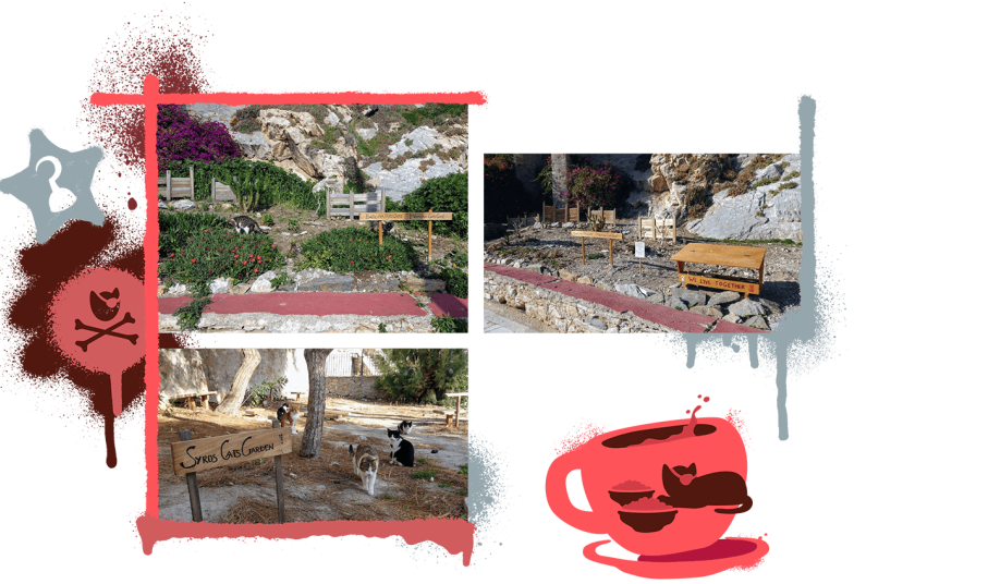 Τα γάτο - καφενεία –βασική δράση της «We Live Together»- αποτελούν χώρους του δημόσιου αστικού περιβάλλοντος και στοχεύουν στην καλύτερη ένταξη του ζώου στις γειτονιές της πόλης. Η πειγατική ζωή θέλει καλή παρέα, ωραία λουλούδια και φυτά. Η καθαριότητα, ο όμορφος περιποιημένος χώρος και το άφθονο καλό φαγητό είναι απαραίτητα στοιχεία στα γατοκαφενεία της Σύρου. Όλα αυτά είναι στα χέρια των γειτόνων που μένουν πολύ κοντά και τα προσφέρουν εθελοντικά. Κοινωνικοποίηση, παιχνίδι και καλό πειγατικό φαγητό! Στα γατοκαφενεία, οι πειγατές γιορτάζουν τις επιτυχίες τους και απολαμβάνουν τον Κυκλαδίτικο ήλιο, πάντα σε καθαρό, περιποιημένο και καλλωπισμένο περιβάλλον, γεμάτο καλό φαγητό και καθαρό νερό. Εκεί φαίνεται να έχουν κυριαρχήσει και με το παραπάνω! Οι άνθρωποι για να τους ευχαριστήσουν που υπάρχουν, τους τα έχουν όλα έτοιμα. Η ζωή του Πειγατή είναι δυο φορές ζωή! Ή μήπως επτά; Όσες κι αν είναι, σε ένα γατοκαφενείο είναι πάντα καλύτερες.
