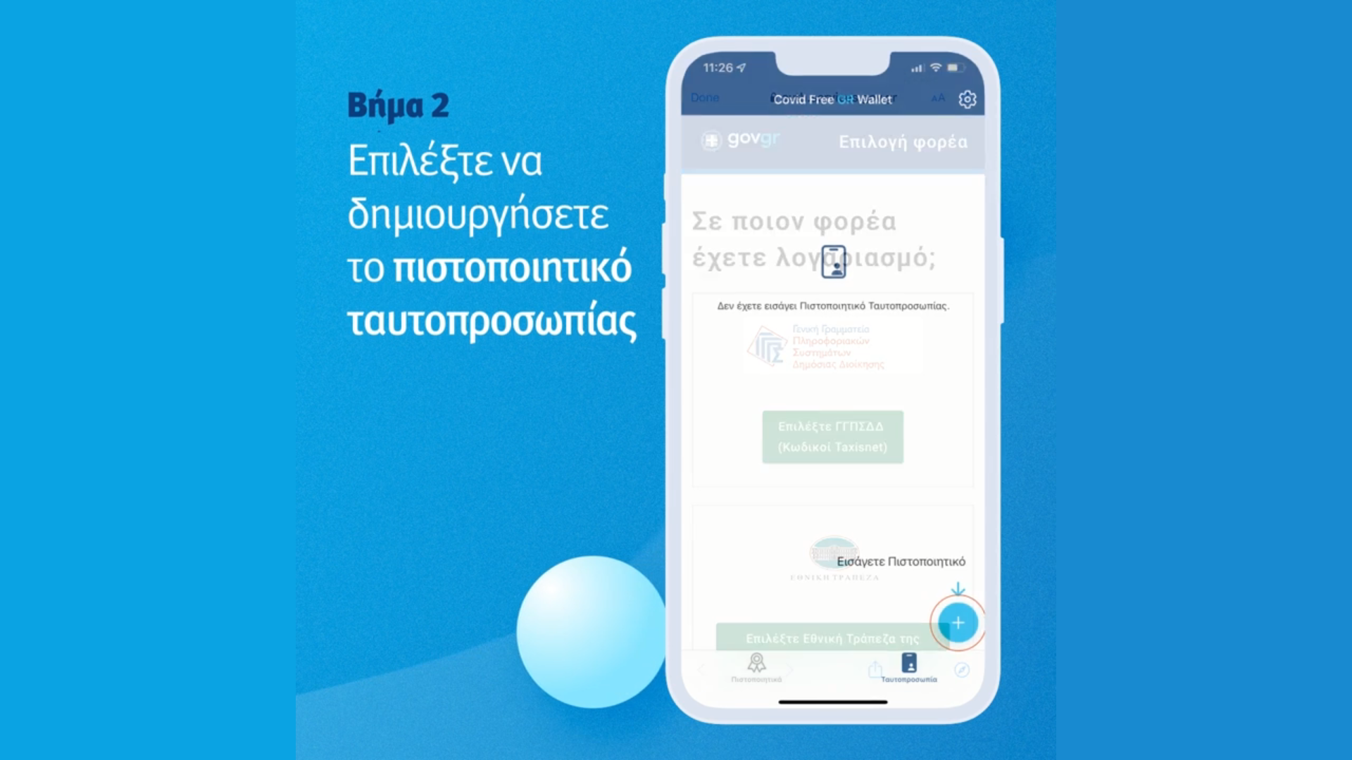 Η διαδικασία δημιουργίας και αποθήκευσης του πιστοποιητικού ταυτοπροσωπίας είναι ιδιαίτερα απλή. Αρχικά ο πολίτης πρέπει να εγκαταστήσει μέσα από τις πλατφόρμες iOS και Android για κινητές συσκευές και tablet τη νέα έκδοση της εφαρμογής Covid Free GR Wallet. Στη συνέχεια, μπαίνει την οθόνη «Ταυτοπροσωπία» και ξεκινά τη διαδικασία έκδοσης του εγγράφου εισάγοντας τους κωδικούς Taxisnet ή web banking (εφόσον ο τραπεζικός λογαριασμός που αντιστοιχεί στους κωδικούς web banking είναι επικαιροποιημένος). Για την ολοκλήρωση της αυθεντικοποίησης απαιτείται η εισαγωγή κωδικού μιας χρήσης (One Time Password – OTP), ο οποίος αποστέλλεται με SMS στον επιβεβαιωμένο αριθμό κινητού τηλεφώνου του πολίτη.