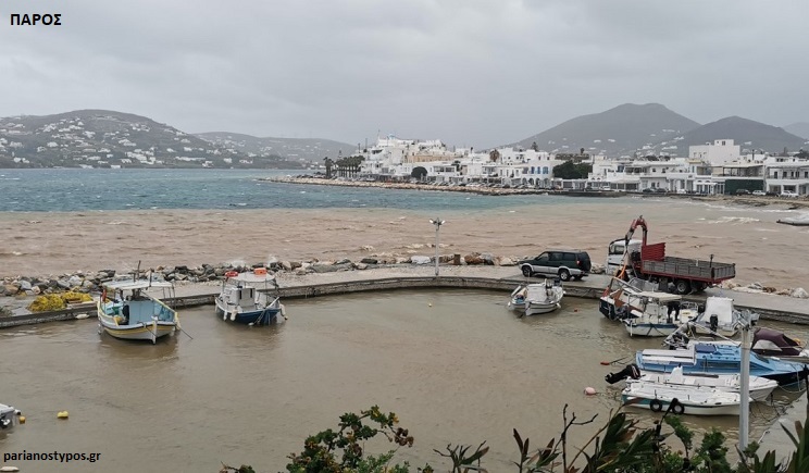 Στην Πάρο, η εντονότατη και συνεχιζόμενη βροχόπτωση, που μόλις σε μισή μέρα είχε φτάσει σχεδόν τα 40 χιλιοστά, «ξύπνησε» χειμάρρους, οι οποίοι μάλιστα, δεδομένου ότι έφτασαν μέχρι τη θάλασσα, «έβαψαν» καφέ το χρώμα της θάλασσας, λόγω των φερτών υλικών που συμπαρέσυραν στο διάβα τους.