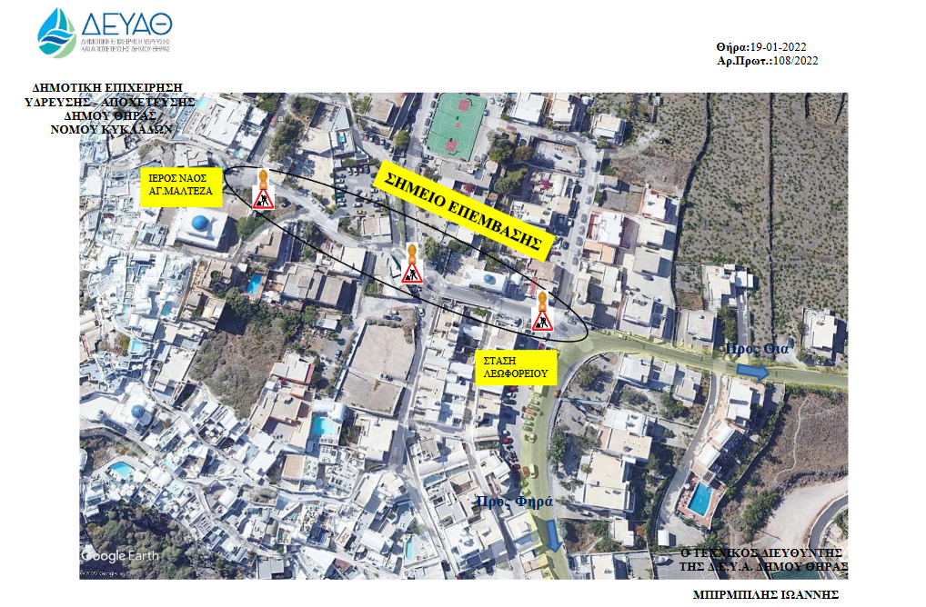 Η Δ.Ε.Υ.Α. Θήρας γνωστοποιεί την περιοδική διακοπή της κυκλοφορίας στην περιοχή του Ημεροβιγλίου και συγκεκριμένα, από την στάση του Ημεροβιγλίου έως τον Ιερό Ναό της Παναγίας Μαλτέζας λόγω απαραίτητων εργασιών στο πλαίσιο επέκτασης του δικτύου ύδρευσης της Δ.Ε.Υ.Α.Θ.