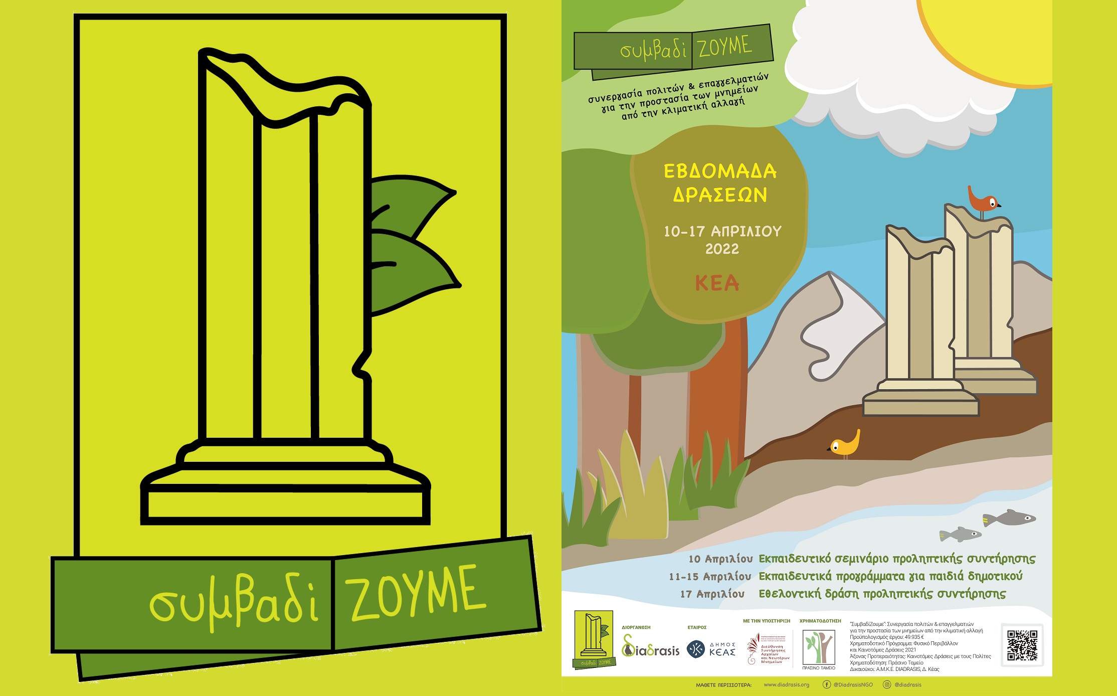 Μια εβδομάδα για την προστασία των μνημείων από την κλιματική αλλαγή μέσω της συνεργασίας ενεργών πολιτών και επαγγελματιών του πολιτισμού στην Κέα. Η diadrasis σε συνεργασία με το Δήμο Κέας και με την υποστήριξη της Διεύθυνσης Συντήρησης Αρχαίων και Νεωτέρων Μνημείων του ΥΠΠΟΑ, στο πλαίσιο του έργου «ΣυμβαδίΖουμε συνεργασία πολιτών και επαγγελματιών για την προστασία των μνημείων από την κλιματική αλλαγή» που χρηματοδοτείται από το Πράσινο Ταμείο, διοργανώνει μια σειρά δράσεων από τις 10 έως τις 17 Απριλίου σε διάφορα σημεία της Κέας.