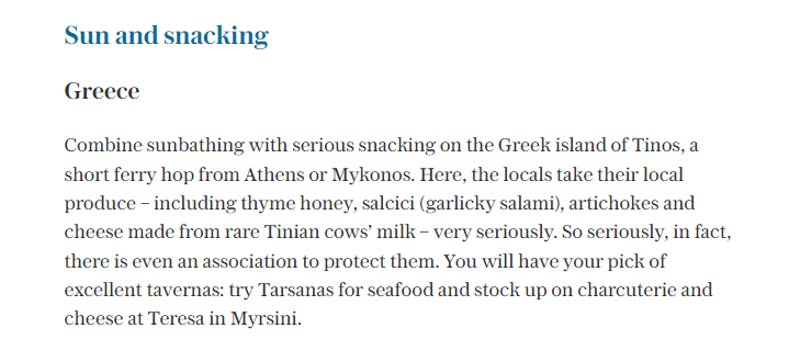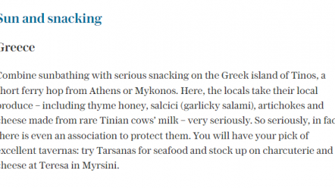 Όπως ενημερώνει η MTC Group, η εφημερίδα αναφέρει, πως το νησί συνδυάζει την ηλιοφάνεια με υπέροχα γεύματα, με τους ντόπιους να αξιοποιούν προϊόντα δικής τους παραγωγής (θυμαρίσιο μέλι, σαλάμι και τυρί από ντόπιες αγελάδες).