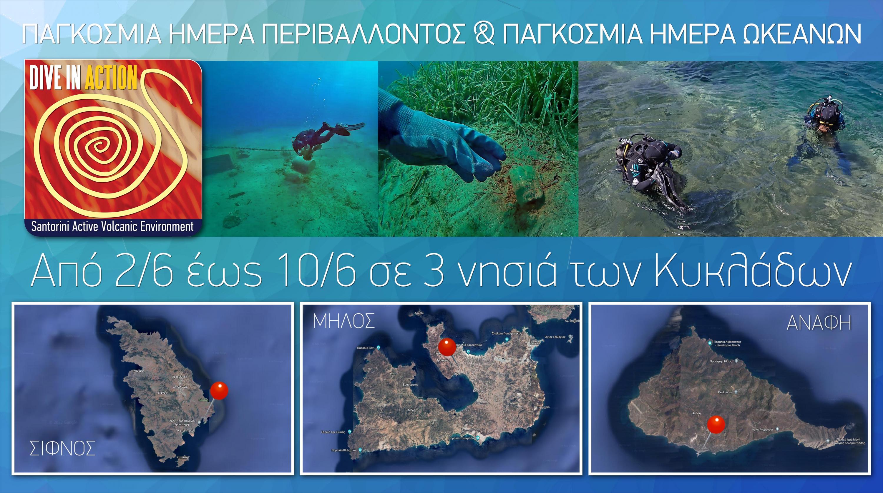 Η Περιβαλλοντική Οργάνωση Dive In Action, από τις 2 Ιουνίου μέχρι τις 10 Ιουνίου 2022, στο πλαίσιο του εορτασμού των 2 κοντινών Παγκόσμιων ημερών, της Ημέρας Περιβάλλοντος 5/6 και Ημέρας των Ωκεανών 8/6, υλοποιεί δράσεις σε 3 νησιά των Κυκλάδων με τους φίλους νησιώτες της Οργάνωσης.