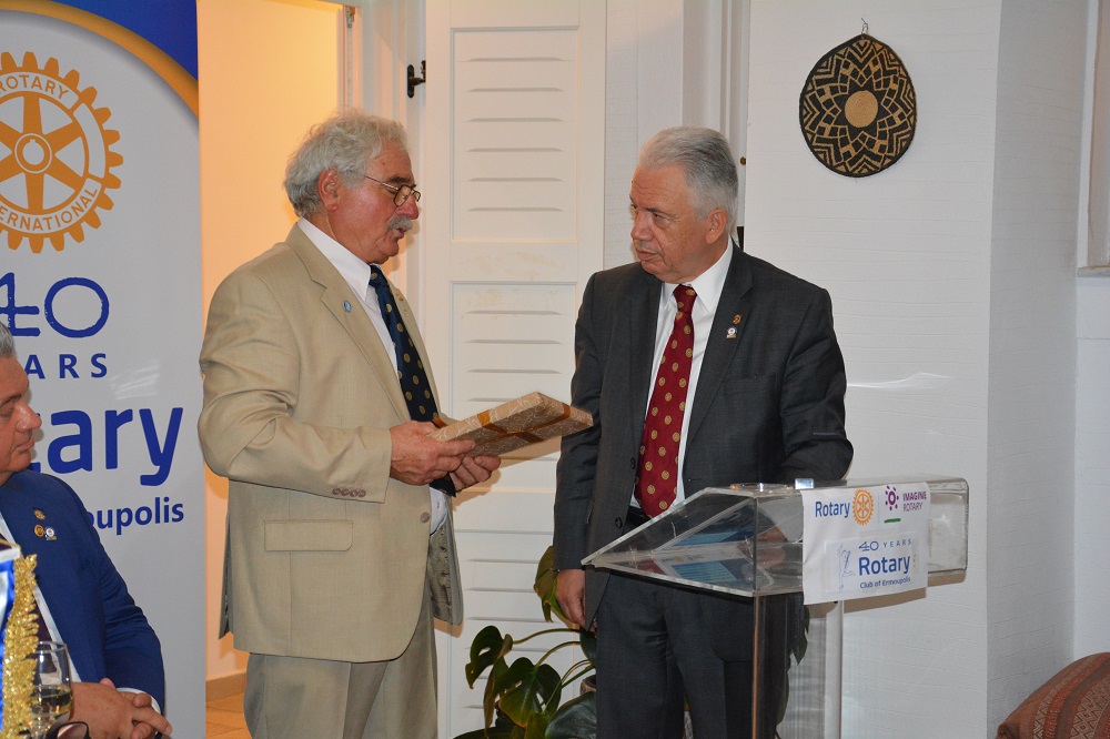 Αμέσως μετά, ακολούθησε η ομιλία του Προέδρου: “Η σημερινή ημέρα είναι πολύ σημαντική και καθοριστική για την πορεία του Ρόταρυ στην Ελλάδα. Οι μέχρι χθες, δύο ροταριανές Περιφέρειες, η 2484 και η 2470, που κάλυπταν τον ελλαδικό χώρο, για λόγους διοικητικούς ενώθηκαν και επίσημα από σήμερα αποτελούν την 2475 νέα ροταριανή περιφέρεια”. Απευθυνόμενος στον Διοικητή Ιωάννη Κατσόγιαννη και στον Β’ Διοικητή Γιάννη Κοιμτζόγλου, ο κ. Τζαναβάρης είπε πως είναι ιδιαίτερη χαρά και τιμή που η πρώτη επίσκεψη του Διοικητή της νέας περιφέρειας είναι στον Ροταριανό Όμιλο Ερμουπόλεως ο οποίος φέτος γιορτάζει τα 40 χρόνια παρουσίας και δράσης του στην κοινωνία.