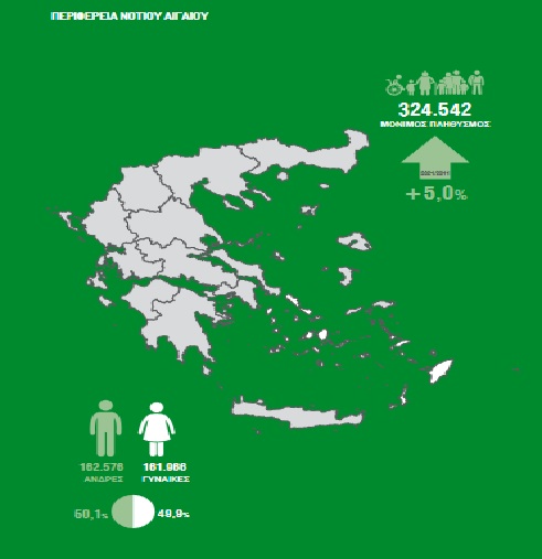 Στην Περιφέρεια Νοτίου Αιγαίου ο συνολικός πληθυσμός, εμφανίζεται αυξημένος κατά 5% σε σχέση με την απογραφή του 2011 και ανέρχεται σε συνολικά 324.542 άτομα, εκ των οποίων 162.576 άνδρες (50,01%) και 161.966 γυναίκες (49,9%).