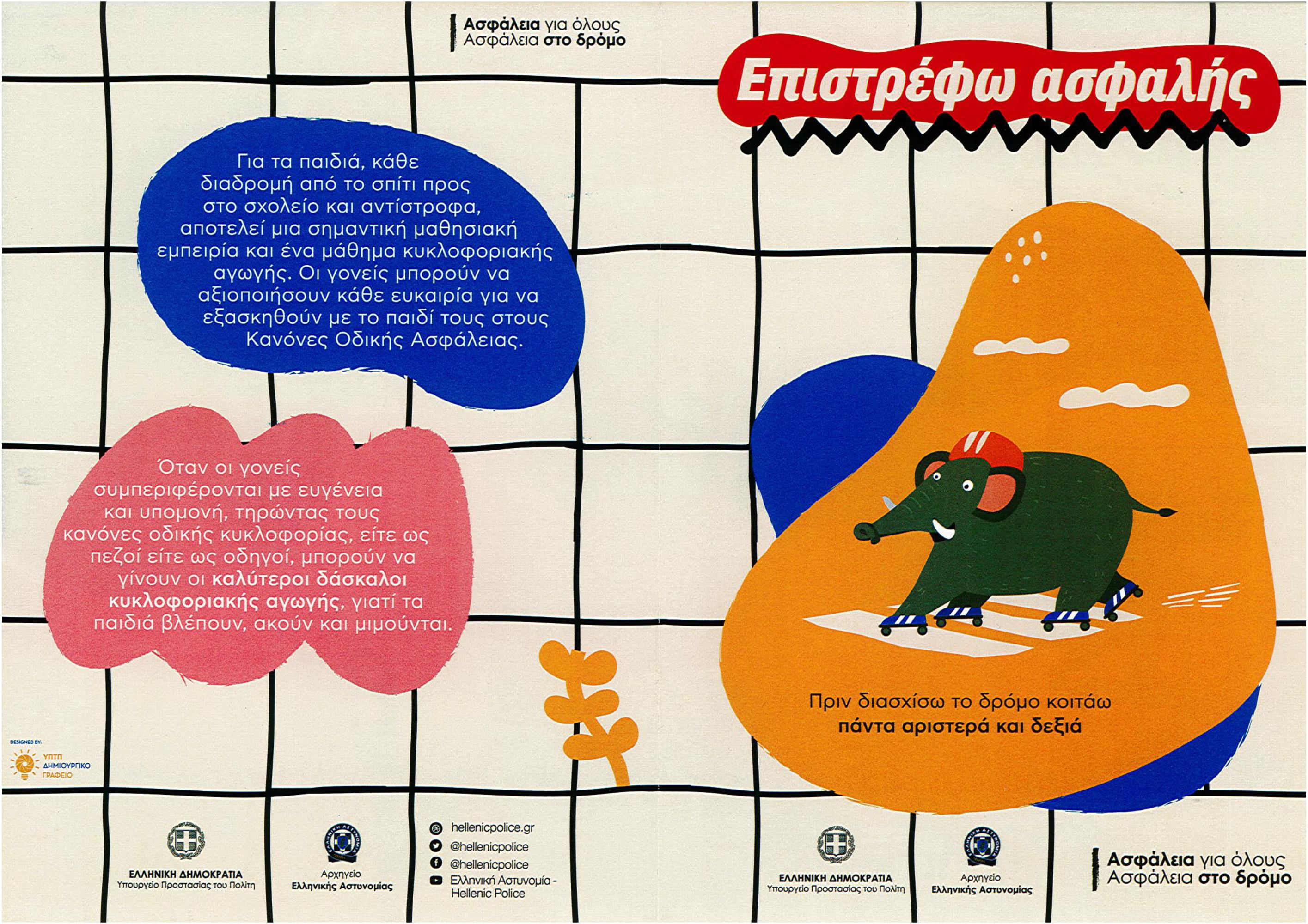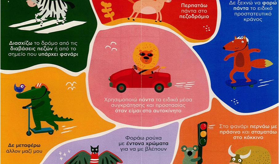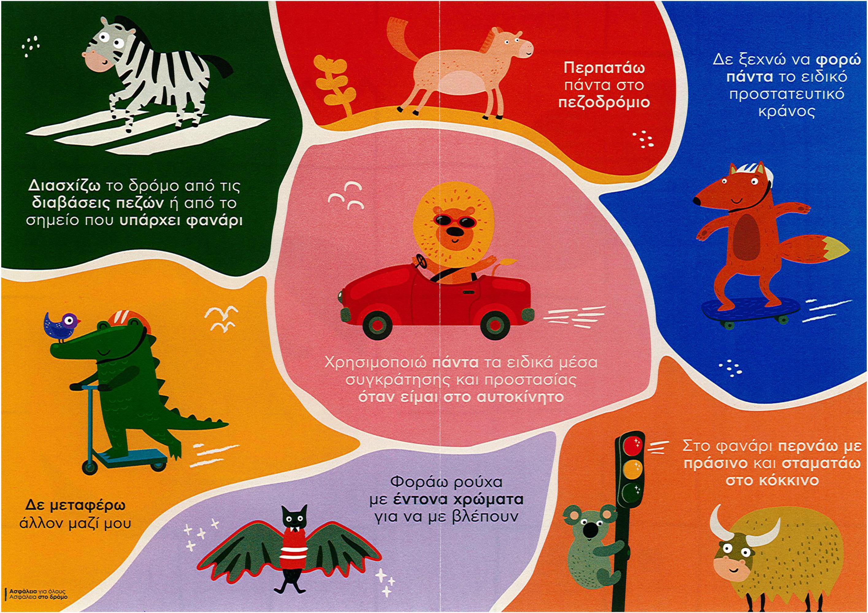 Μέσα από τα συγκεκριμένα φυλλάδια, επισημαίνονται συμβουλές και περιγράφονται με απλό και κατανοητό τρόπο βασικοί κανόνες του Κώδικα Οδικής Κυκλοφορίας για να ενημερωθούν οι μικροί μαθητές πως να κυκλοφορούν στο δρόμο με ασφάλεια. Ειδικότερα αναφέρονται στη χρήση των διαβάσεων πεζών και των πεζοδρομίων, τη συμμόρφωση τους με τους φωτεινούς σηματοδότες κλπ..