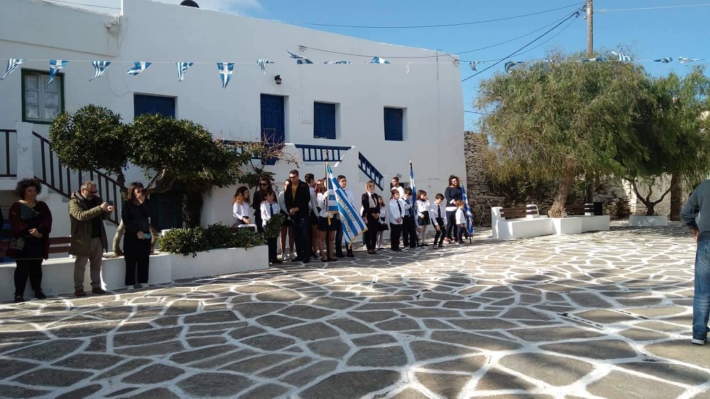 Στη Μύκονο παρέλασαν τα δημόσια και ιδιωτικά νηπιαγωγεία Χώρας και Φτελιάς – Μαραθιού, τα δημοτικά Σχολεία, τα Γυμνάσια και Λύκεια, το Ε.Π.Α.Λ., καθώς και οι πρόσκοποι. Η παρέλαση ξεκίνησε από το Δημαρχείο και κατέληξε στο μνημείο της Μαντώς Μαυρογένους. Ακολούθησαν παραδοσιακοί χοροί μαθητών και μαθητριών και έπειτα πραγματοποιήθηκε ειδική τελετή στο Δημαρχείο, κατά την οποία ο Δήμαρχος Μυκόνου βράβευσε τους επιτυχόντες Μυκονιάτες μαθητές των πανελληνίων.