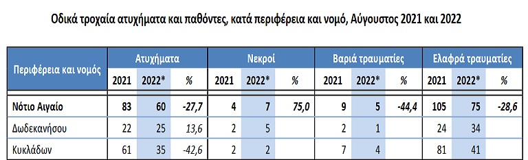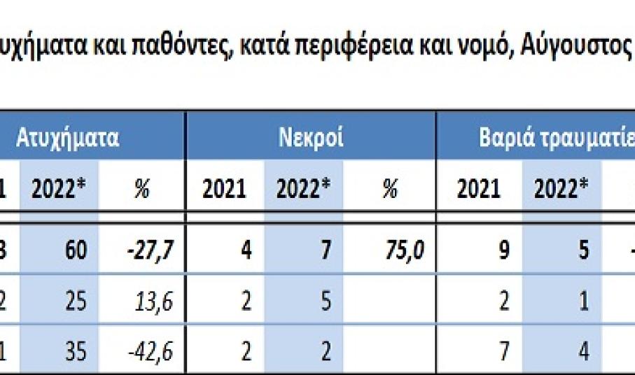 τραυματίες και 1.016 ελαφρά τραυματίες, έναντι 69 νεκρών, 80 βαριά τραυματιών και 1.185 ελαφρά τραυματιών τον Αύγουστο του 2021, παρουσιάζοντας μείωση κατά 23,2% σε νεκρούς, κατά 30,0% σε βαριά τραυματίες και κατά 14,3% σε ελαφρά τραυματίες.
