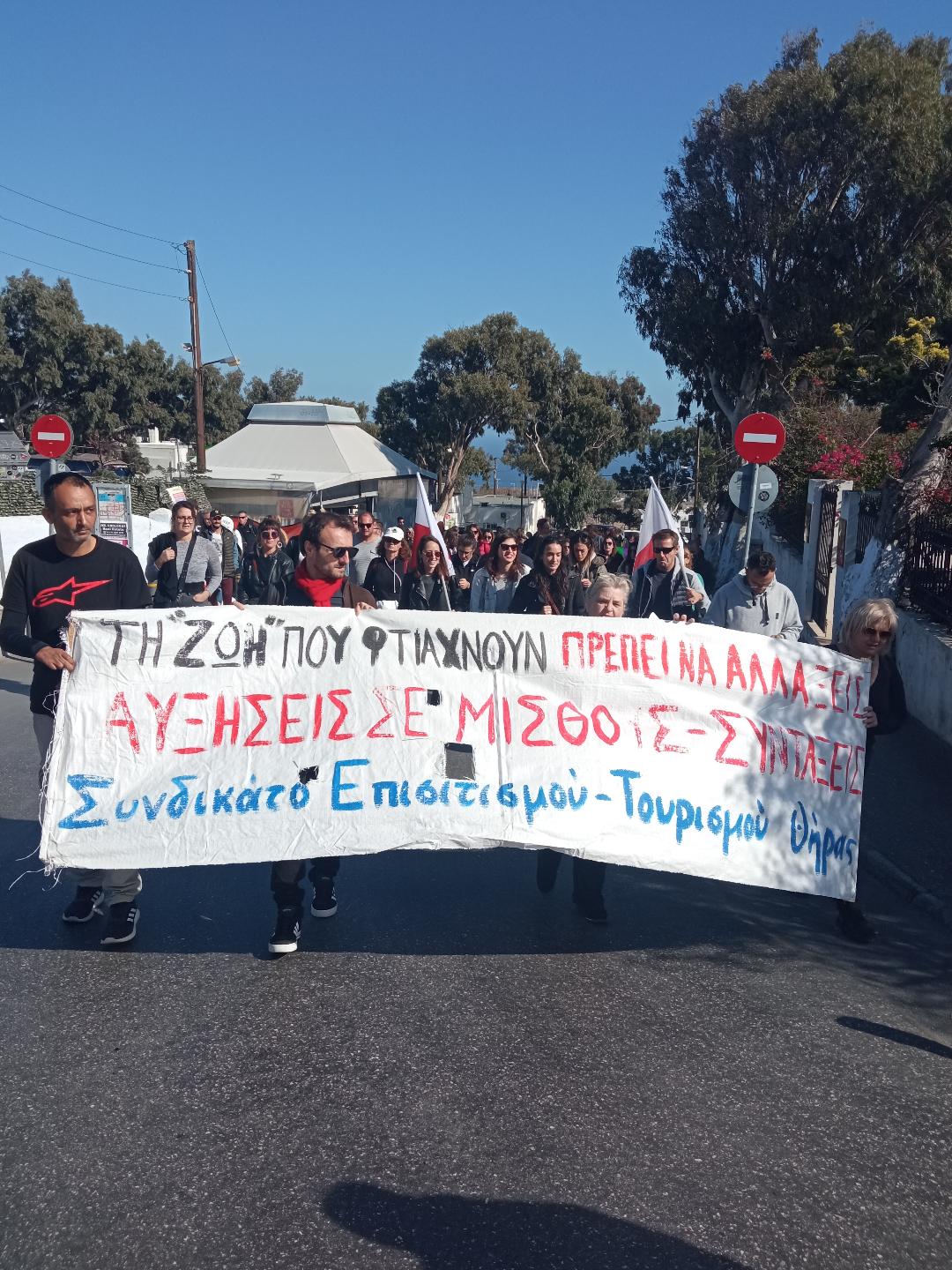 “Η σημερινή μαζική και πετυχημένη απεργιακή συγκέντρωση στην πλατεία των Φηρών, η κοινή δράση των σωματείων του νησιού, οι ομιλίες των εκπροσώπων των σωματείων, η πορεία στο κέντρο των Φηρών, έδωσαν ελπίδα και δύναμη σε κάθε εργαζόμενο του νησιού για τη συνέχιση του αγώνα για αυξήσεις στους μισθούς, για φτηνό ρεύμα και τρόφιμα, για συλλογικές συμβάσεις εργασίας για όλους.