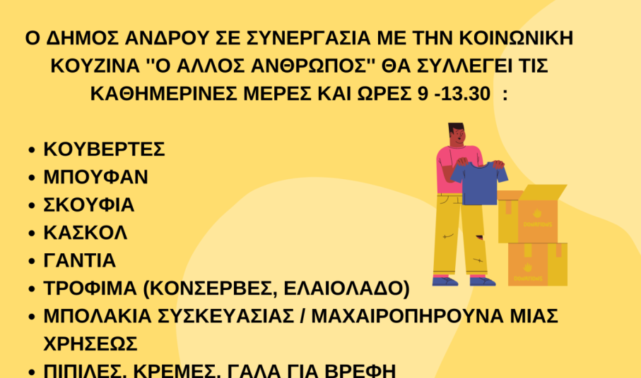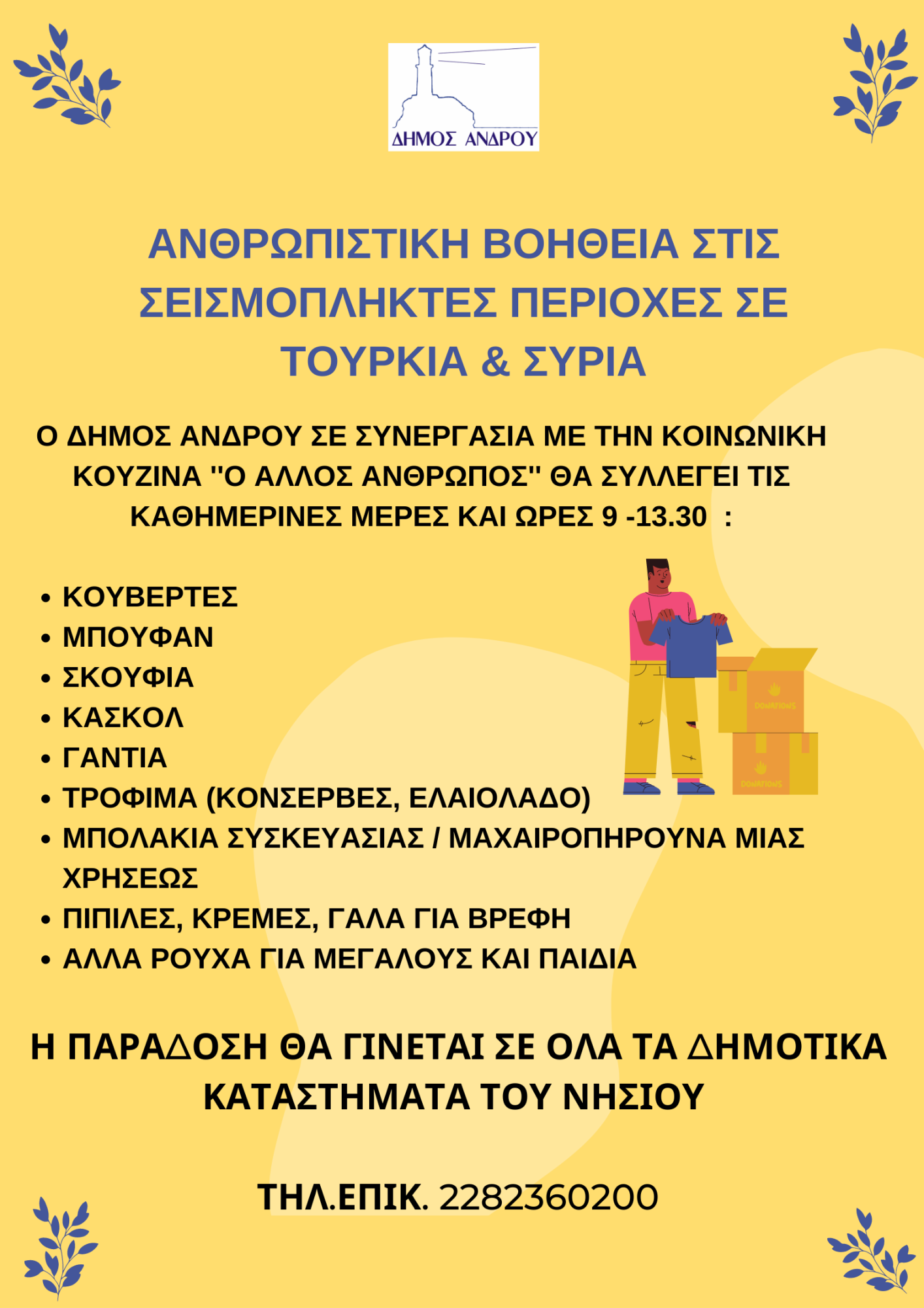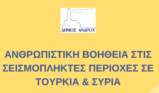 Ο Δήμος Άνδρου συμμετέχει στην παροχή ανθρωπιστικής βοήθειας στις πληγείσες περιοχές της Τουρκίας και της Συρίας σε συνεργασία με την κοινωνική κουζίνα "Ο Άλλος Άνθρωπος". Η παράδοση των προϊόντων θα γίνεται σε όλα τα Δημοτικά Καταστήματα του νησιού.