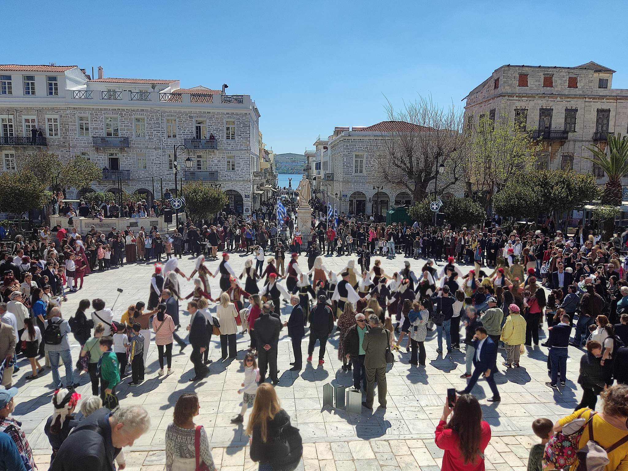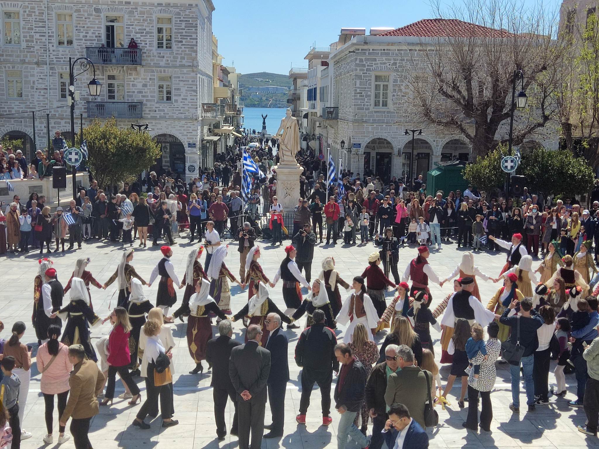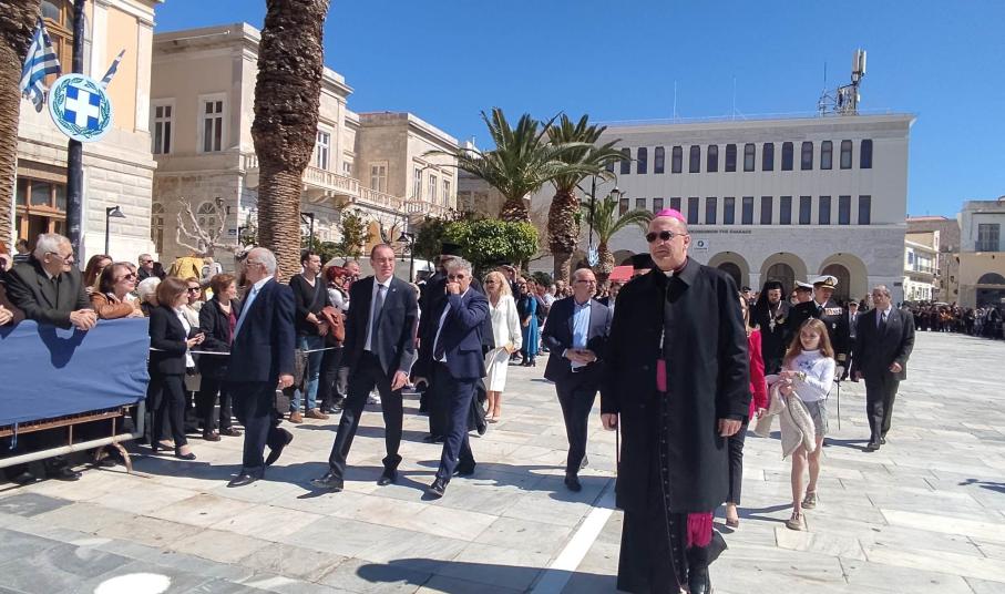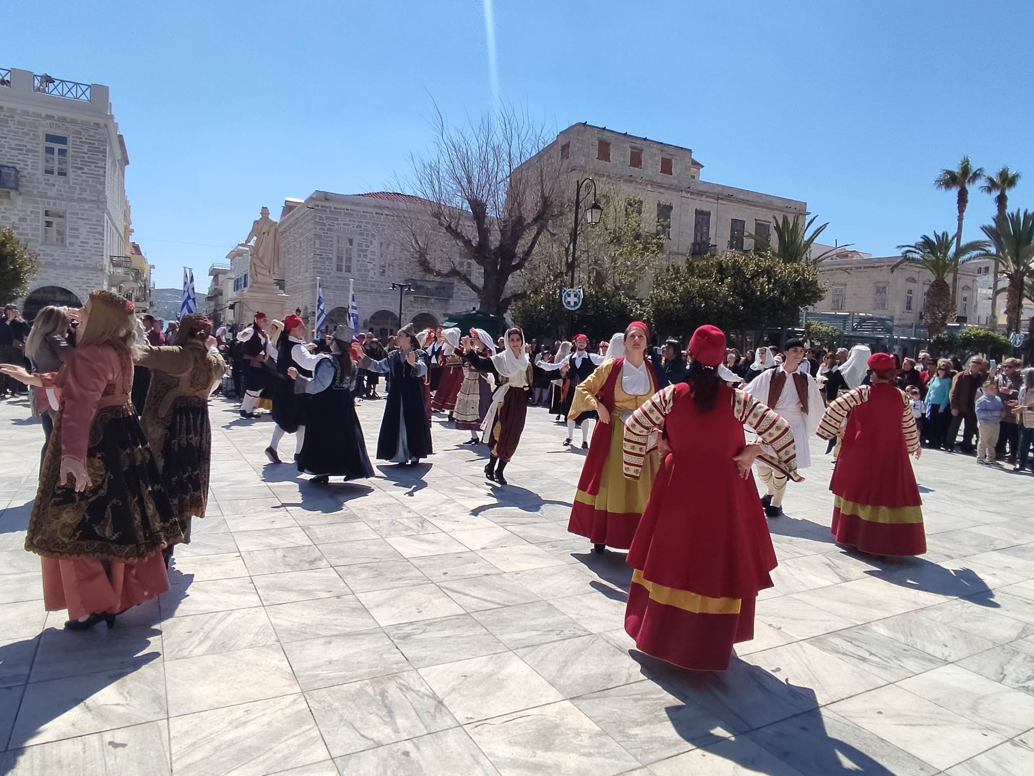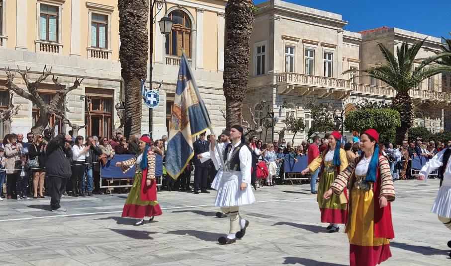 Η παρέλαση στην πλατεία Μιαούλη αποτέλεσε την κορύφωση των επετειακών εκδηλώσεων για την 25η Μαρτίου, της οποίας προηγήθηκε η δοξολογία στον Ι.Ν. του Αγίου Νικολάου Ερμούπολης, με τη συμμετοχή πολλών εκπροσώπων της Αυτοδιοίκησης του Α΄ και του Β΄ βαθμού, εκπροσώπων φορέων και κομματικών οργανώσεων, βουλευτών του νομού και εκπροσώπων των Σωμάτων Ασφαλείας. Η επιμνημόσυνη δέηση έγινε στο εθνικό ηρώο της πόλης και συγκεκριμένα στο κηπάριο μπροστά από τον Ι.Ν. του Αγίου Νικολάου, όπου και κατατέθηκαν στεφάνια.