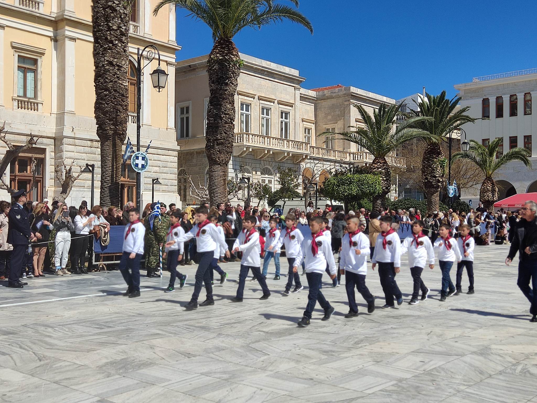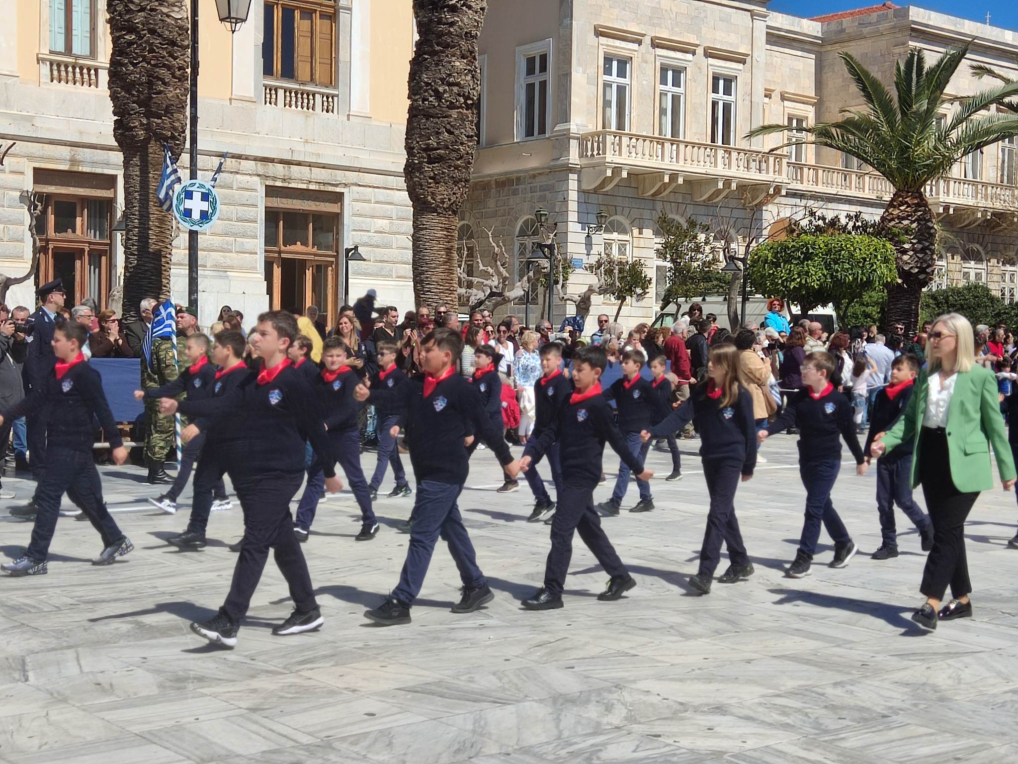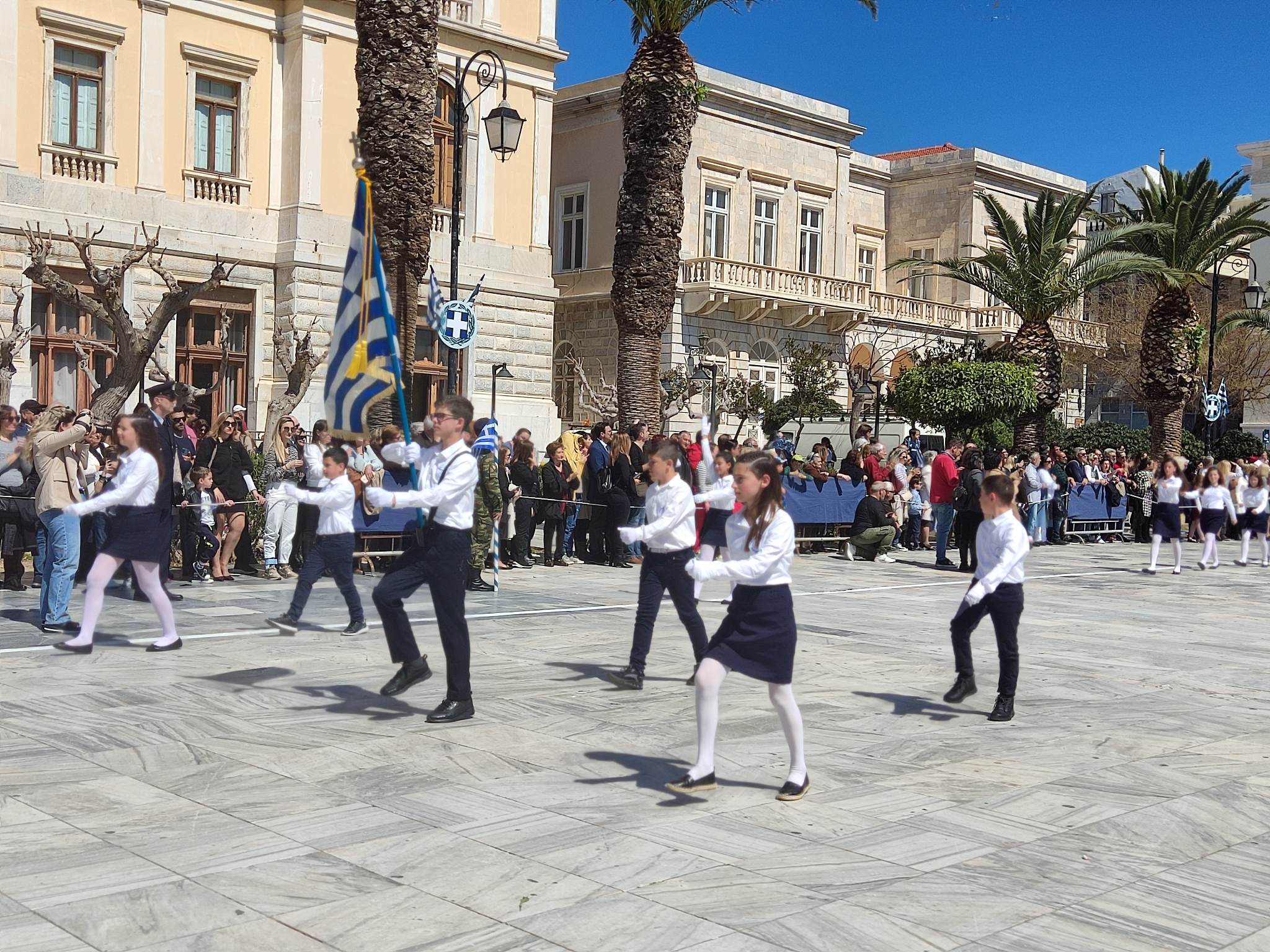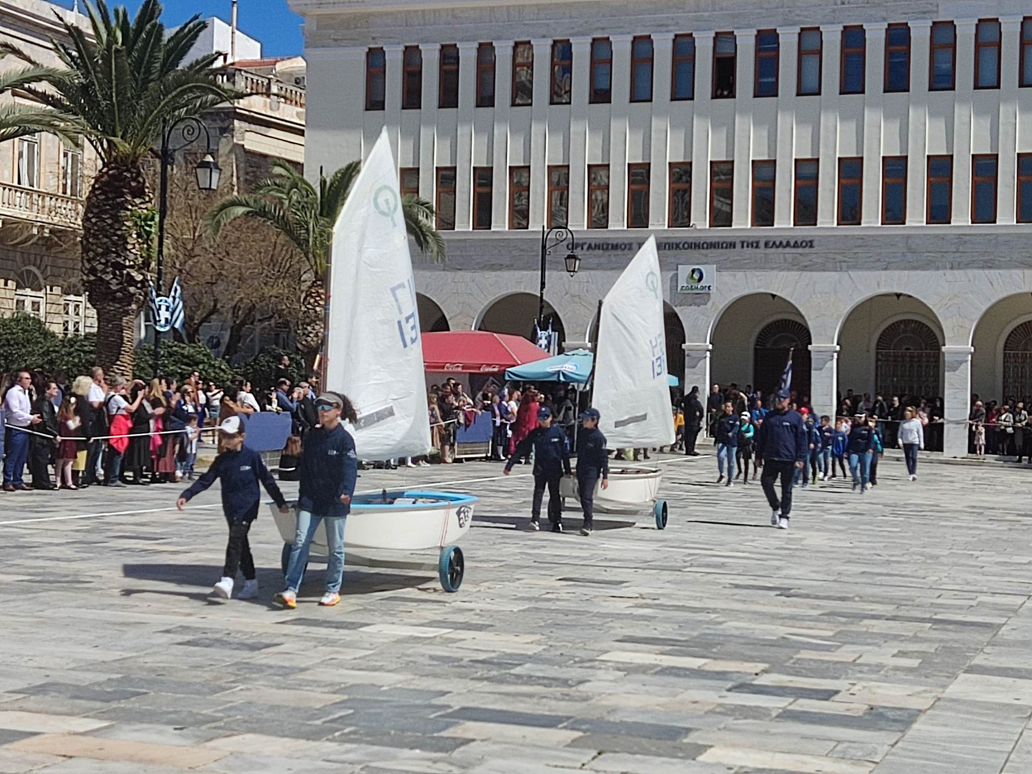 Αμέσως μετά, νέοι και νέες παρέλασαν στην πλατεία Μιούλη, υπό την “καθοδήγηση” της Φιλαρμονικής, με πλήθος κόσμου να παρακολουθεί, ενώ νωρίτερα το πρωί έλαβε χώρα η αποκάλυψη της πολεμικής σημαίας από το ΤΕΘ Ερμούπολης έμπροσθεν του ανδριάντα του Ναυάρχου Μιαούλη..